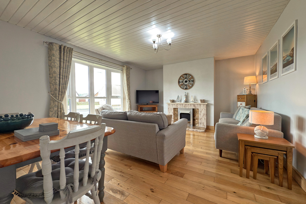 Bow bay window to the front; tiled fireplace with electric heater; solid wood floor; space for dining.