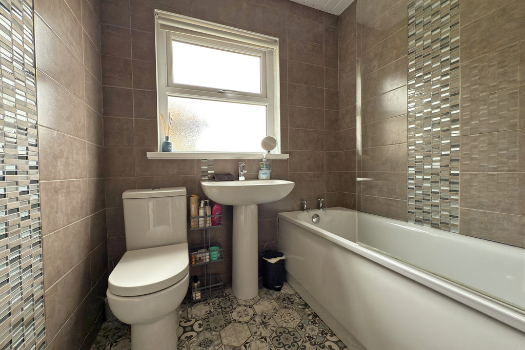 Panel bath with electric shower; toilet; wash hand basin; tiled walls; vinyl floor.
