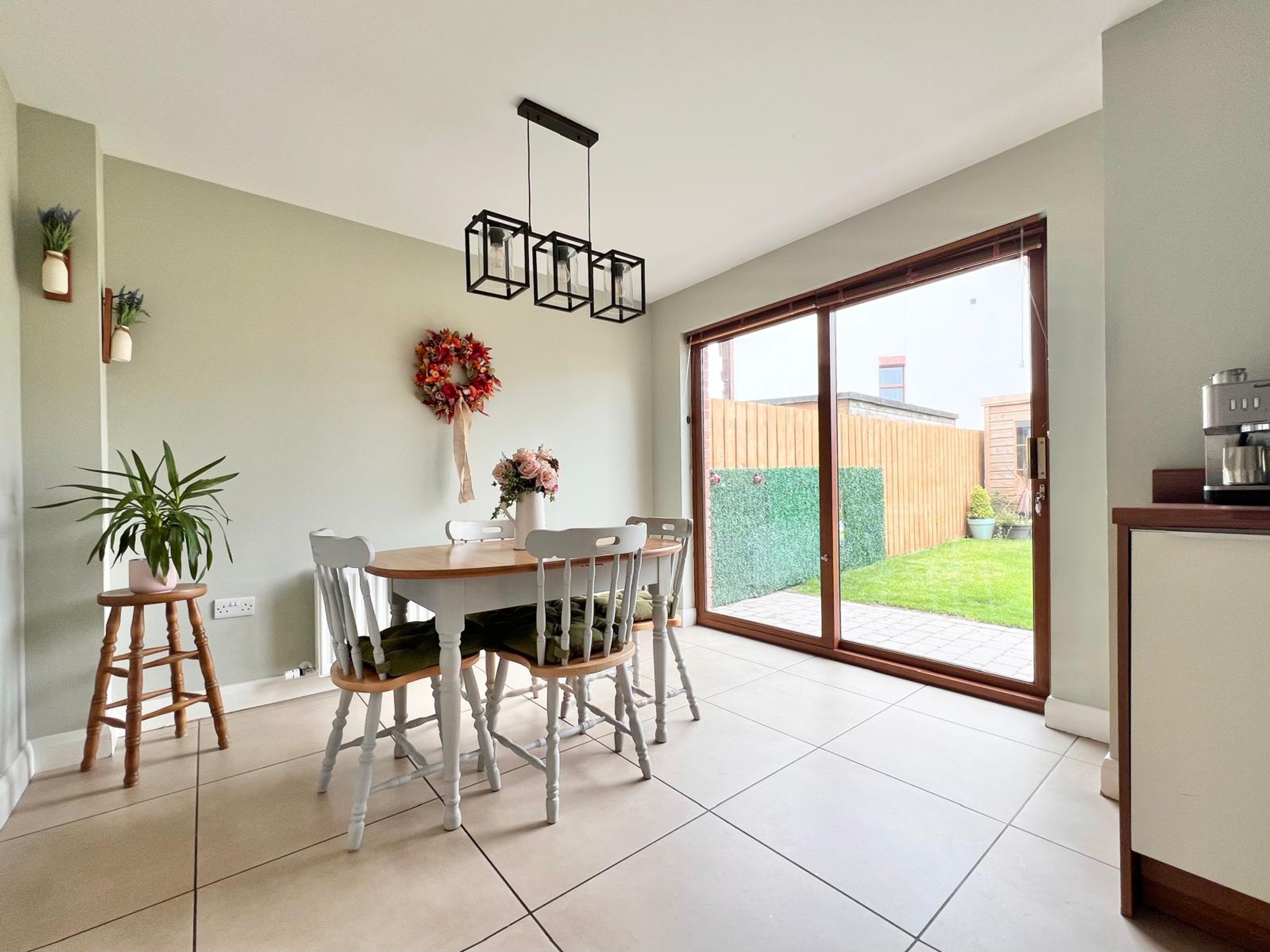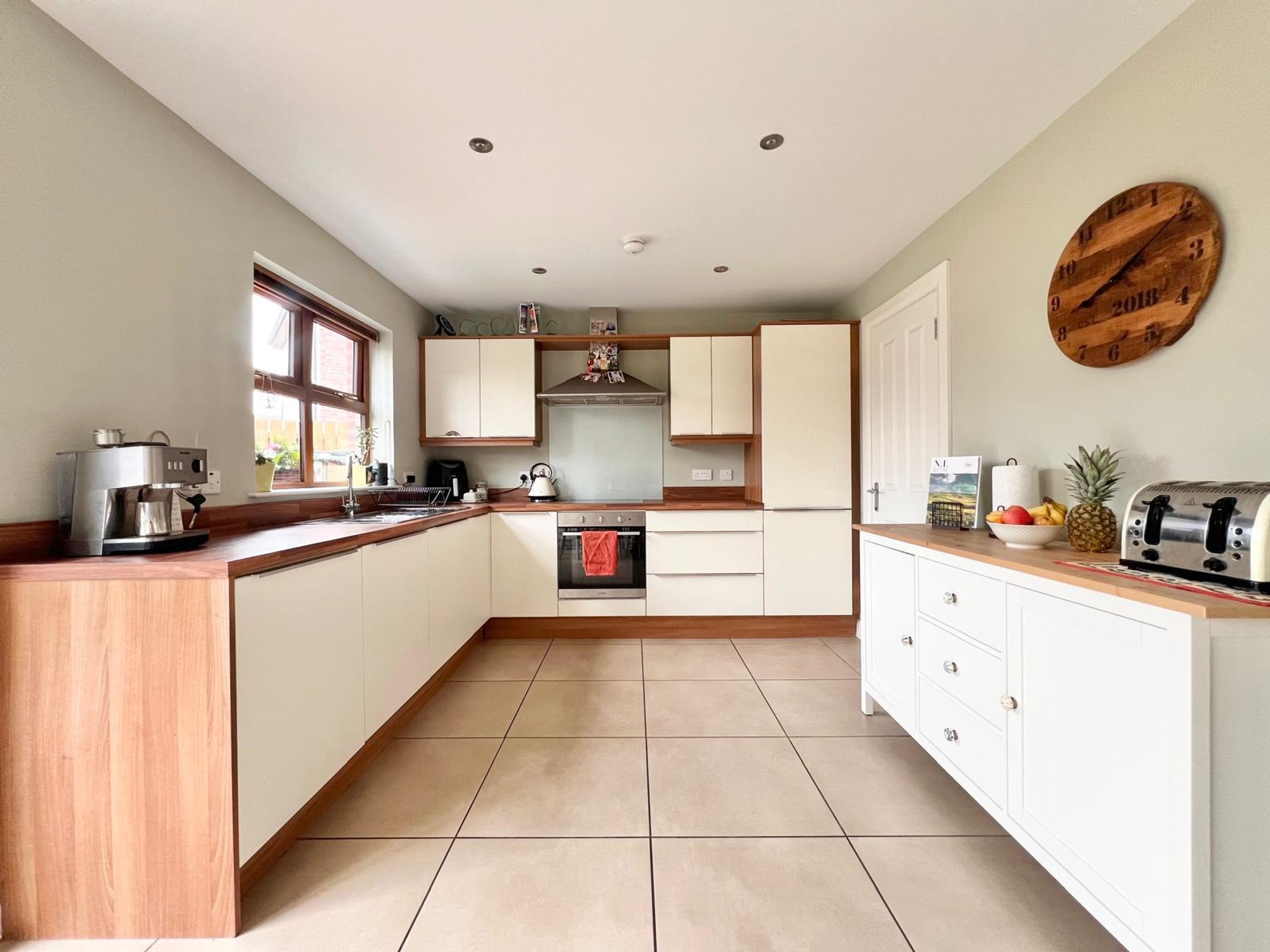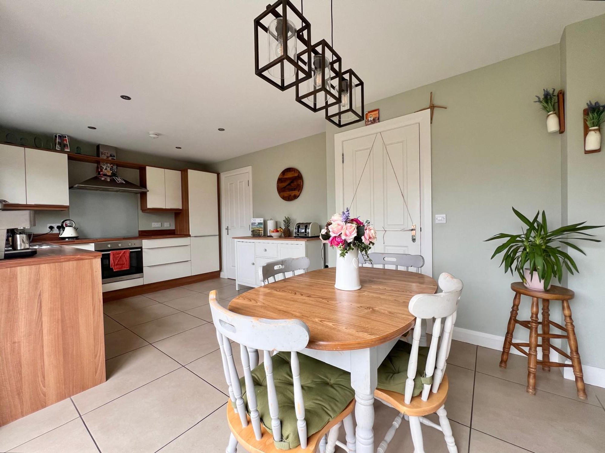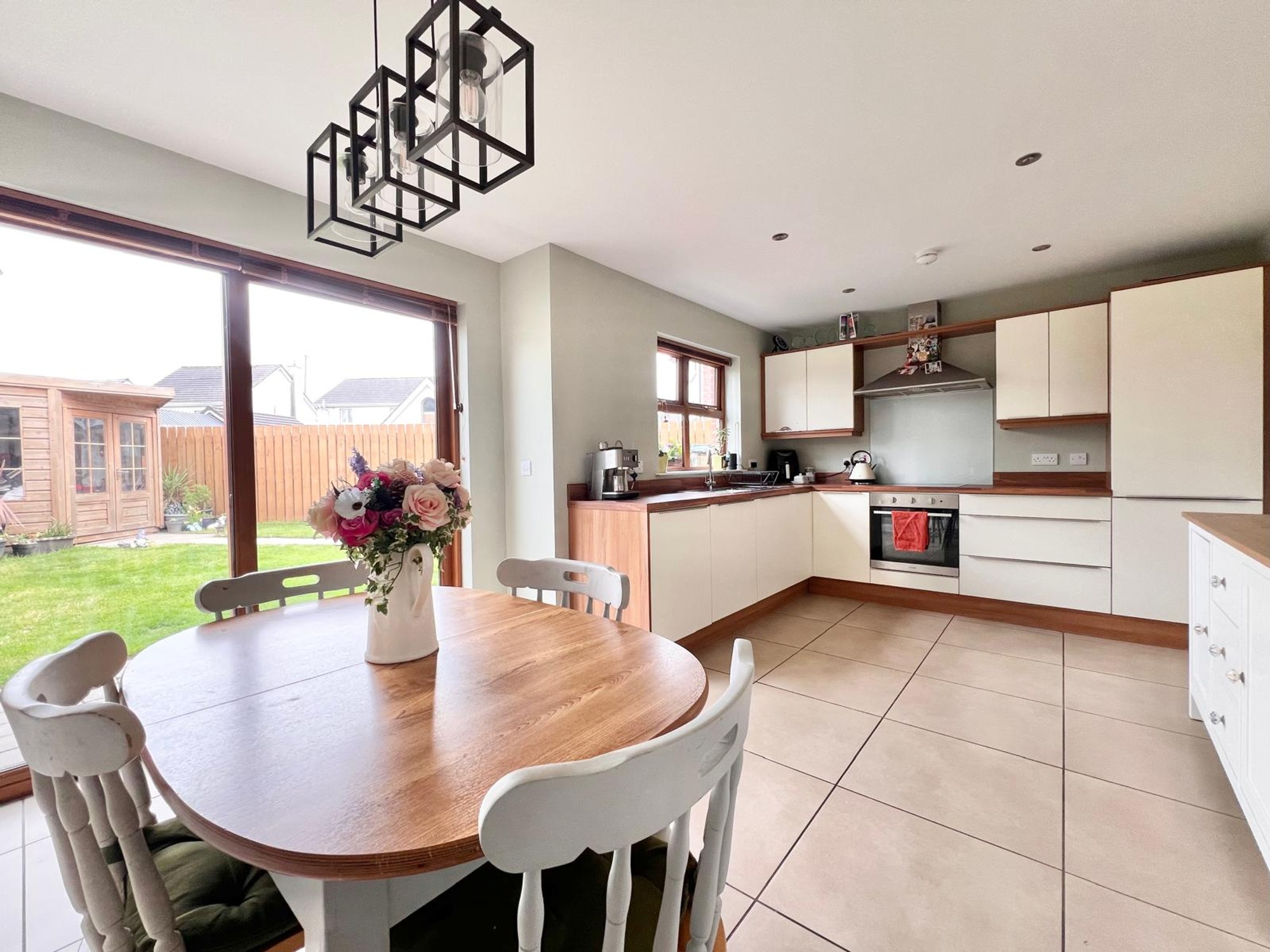 With eye & low level units, stainless steel sink unit, electric hob & oven, extractor fan, integrated dishwasher and fridge freezer, recessed lights, dining area, floor fully tiled, patio doors to rear garden.