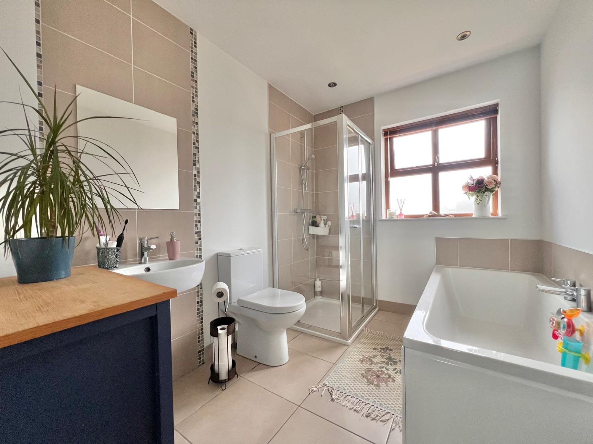 With wc, whb, bath & separate mixer shower, chrome towel rail, recessed lights, walls part tiled, floor fully tiled.