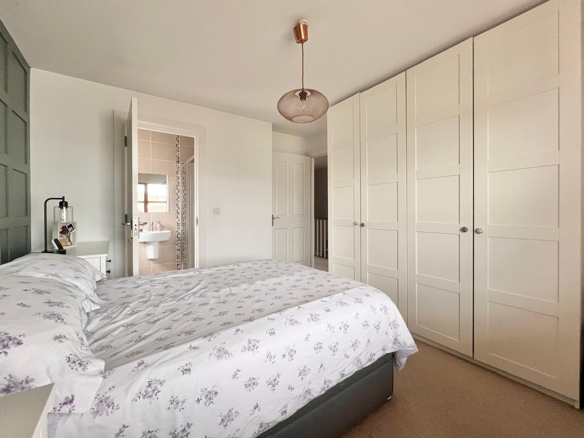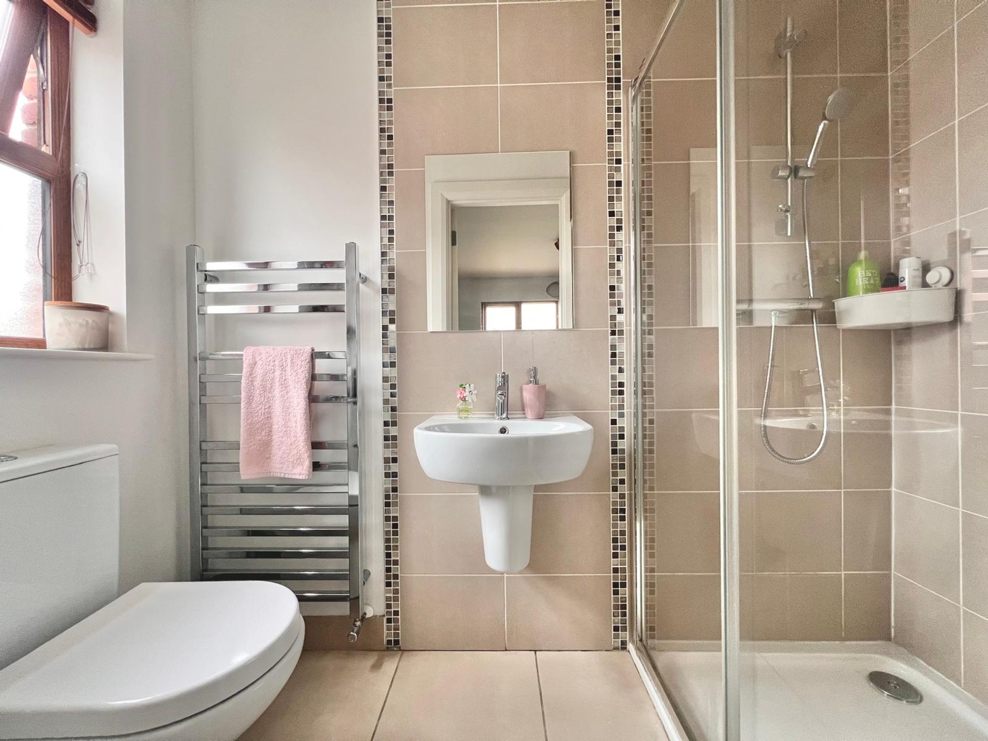 En-suite, wc, whb, separate mixer shower, walls part tiled, floor fully tiled.
