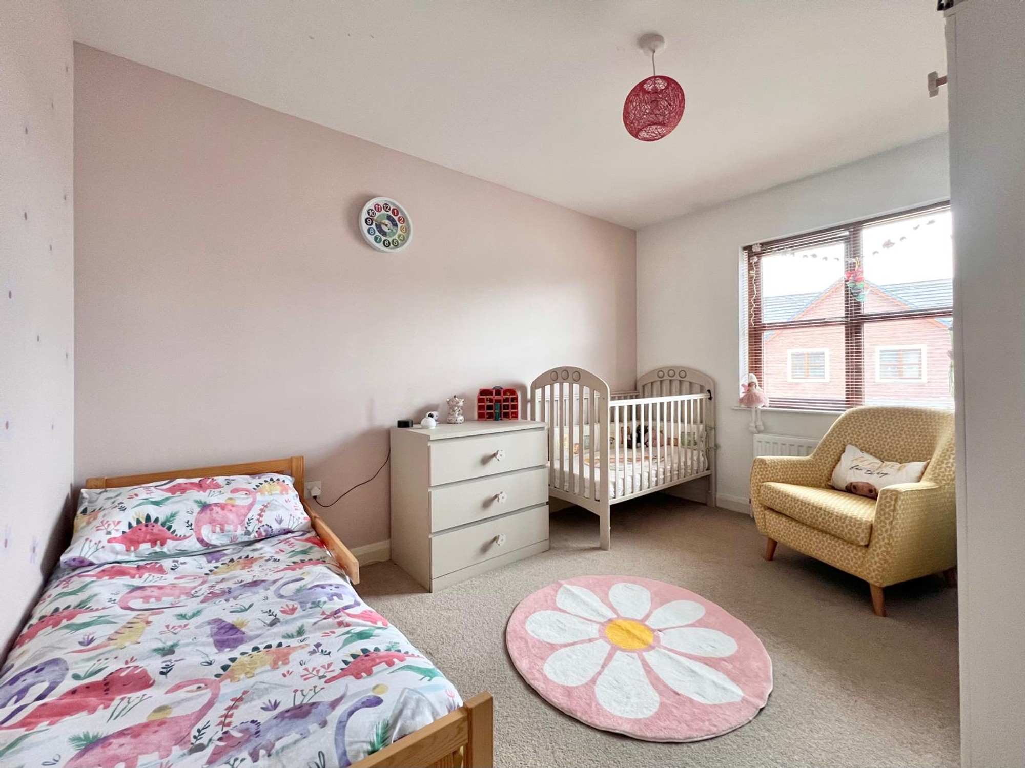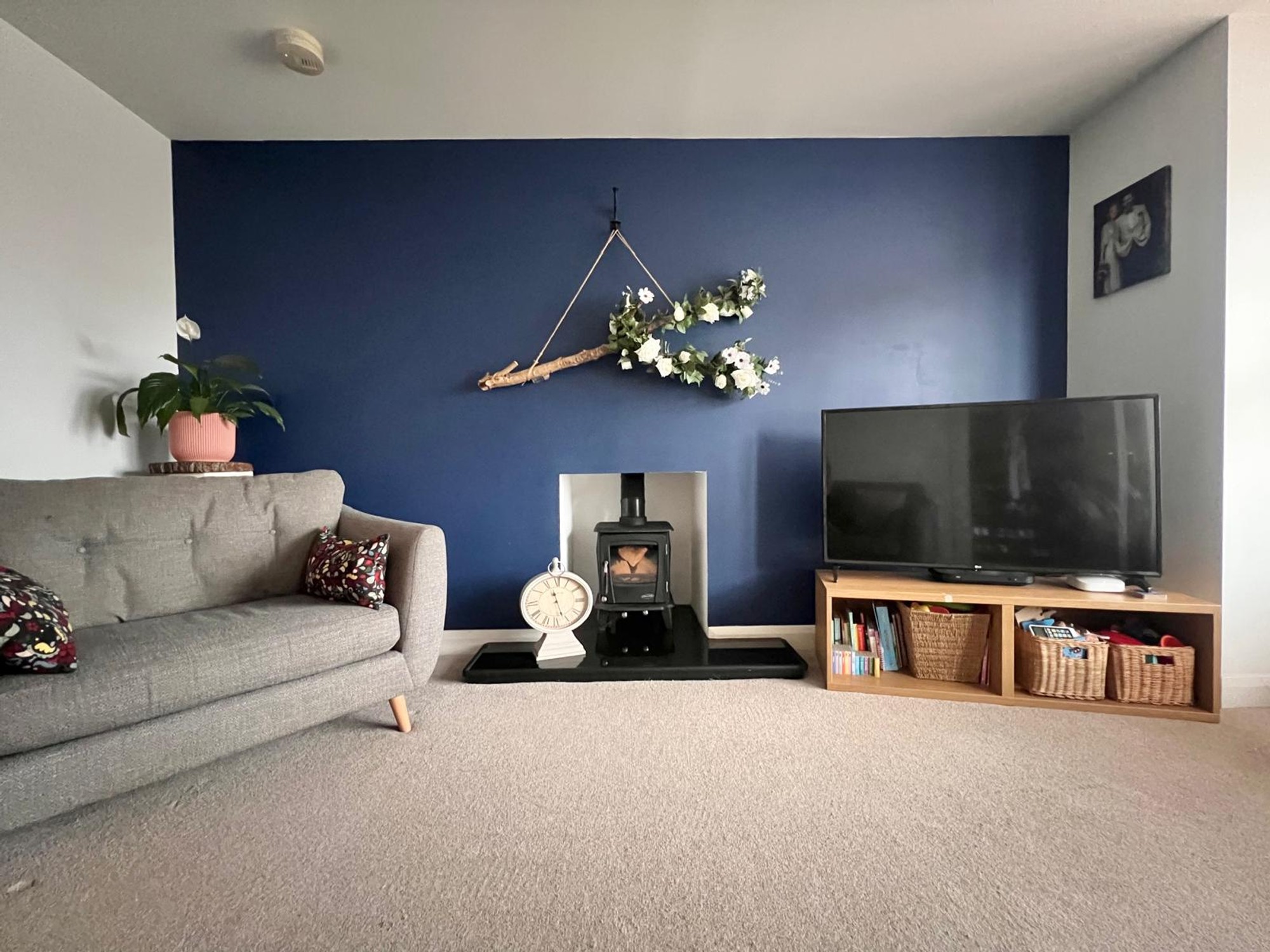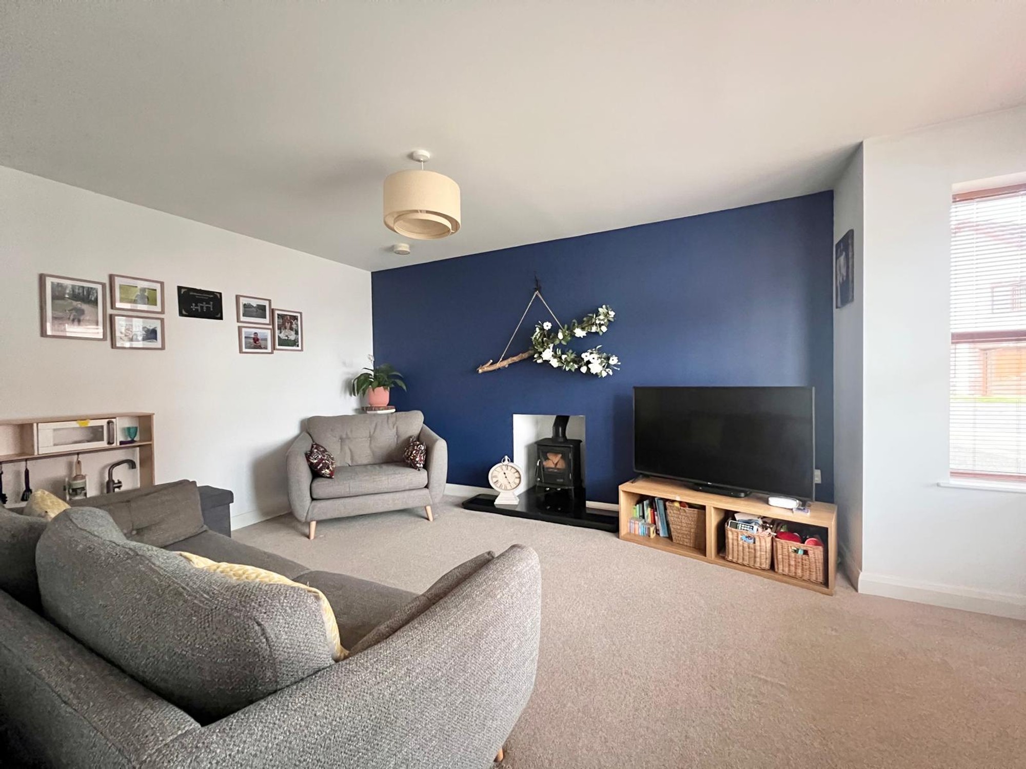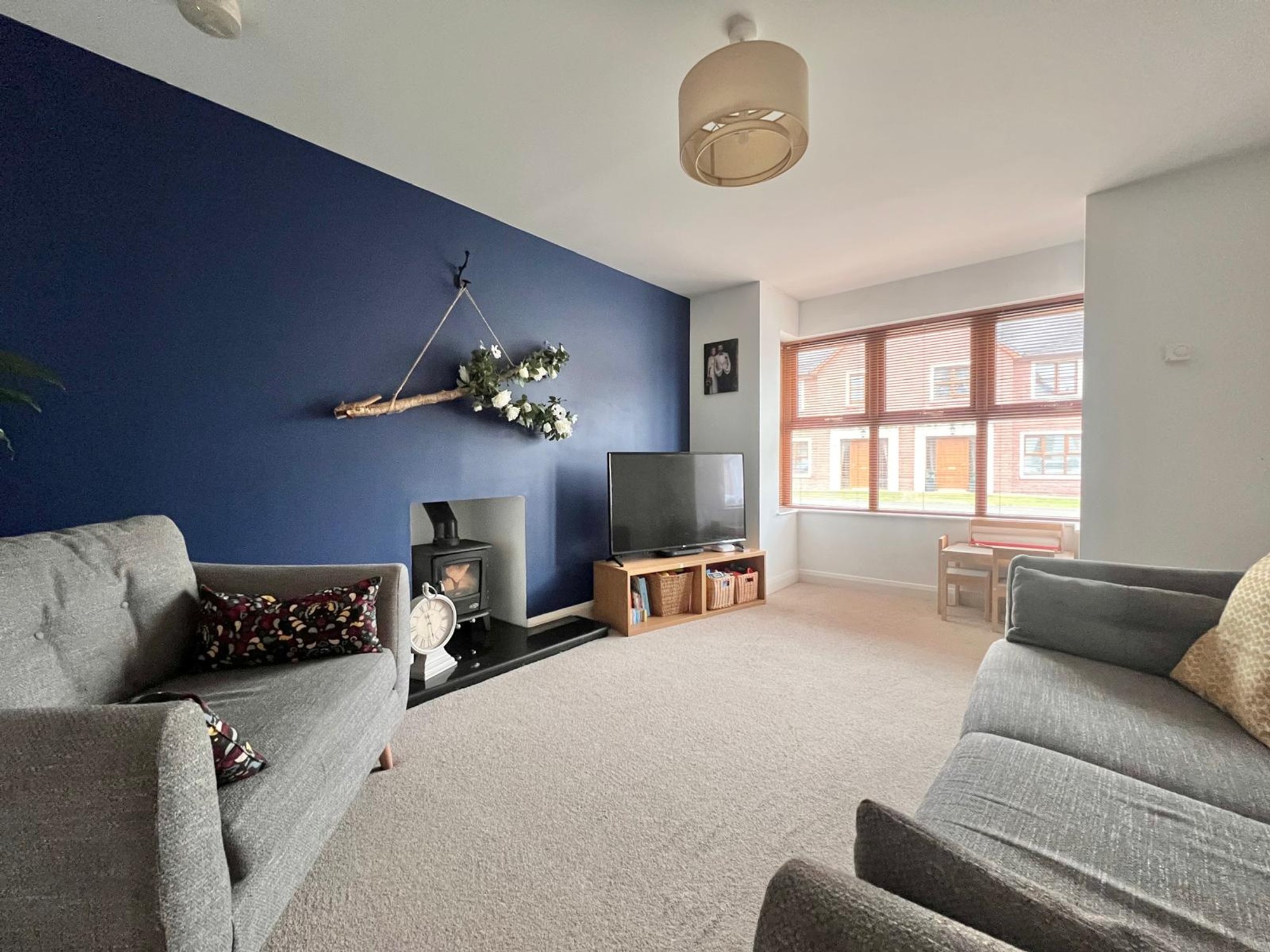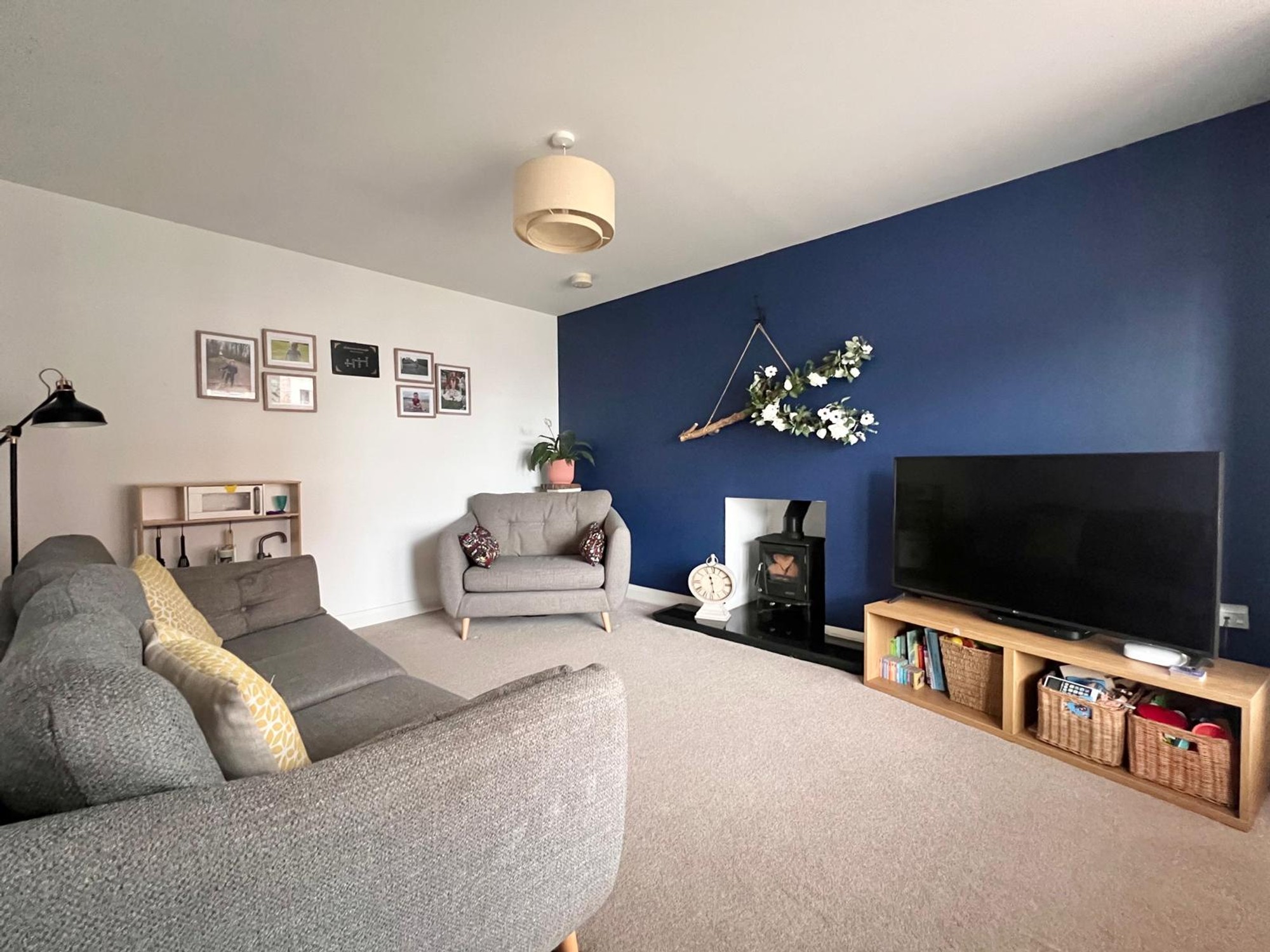 With feature wood burning stove, bay window, carpet, tv point.