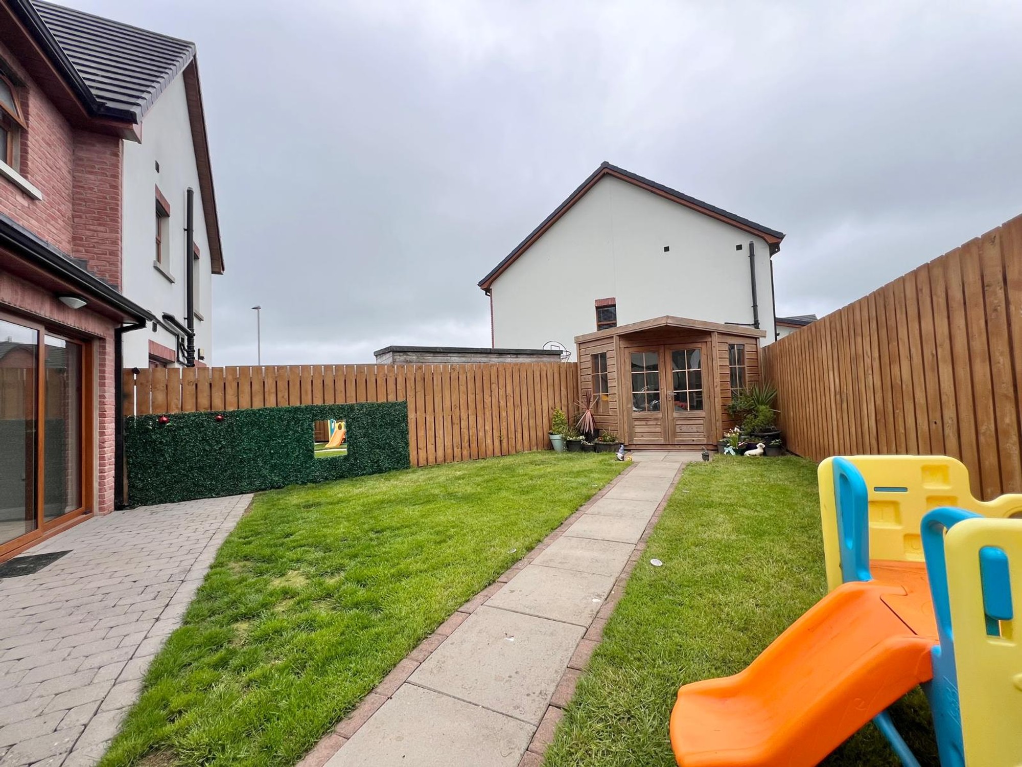 Spacious gardens to the front and rear of house laid in lawn, patio paved area to the side & rear, fully enclosed with wood fence.