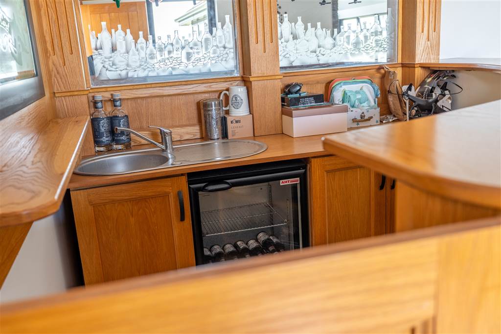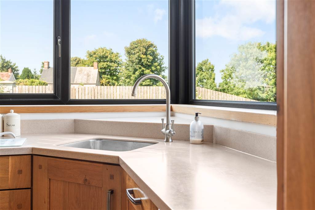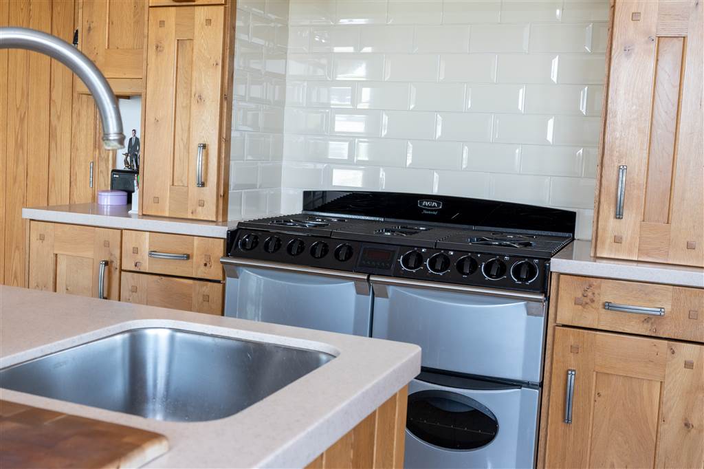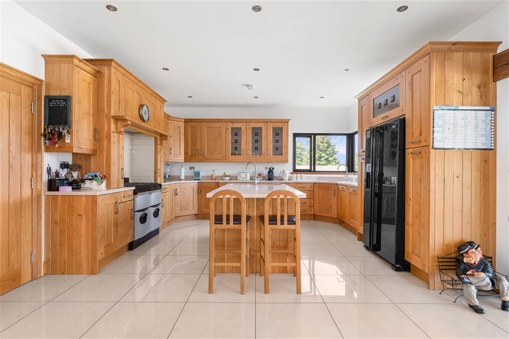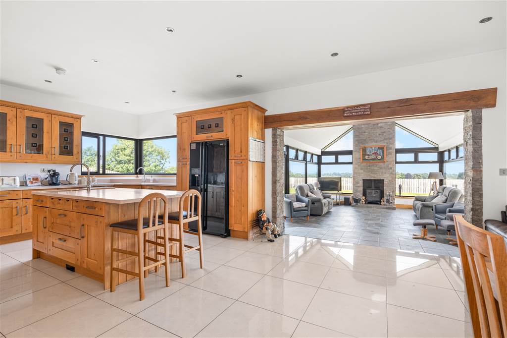 With a range of eye and low-level Solid Oak fitted units, stainless-steel sink unit with stainless-steel mixer tap. Space for Aga stove. Space for American style fridge-freezer. Plumbed for dishwasher. Integrated bin cupboard. Cutlery drawers. Saucepan drawers. Glazed display cupboards. Kitchen island with stainless-steel sink unit and stainless-steel mixer tap, seating area. Spacious area for dining. Bar with fitted low-level units, stainless-steel sink unit and drainer with stainless-steel mixer tap. Spot lighting to ceiling. Tiled flooring. Open plan to sun room.
