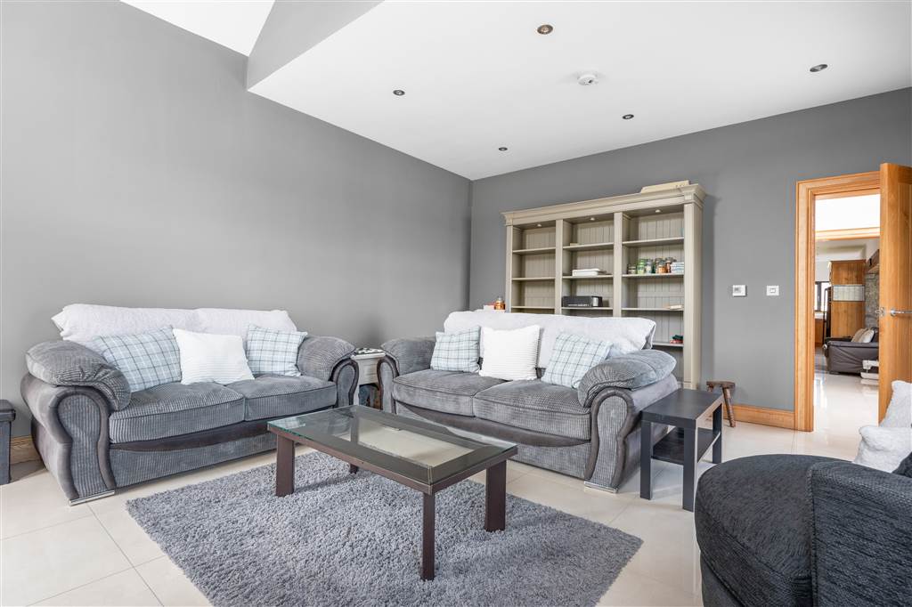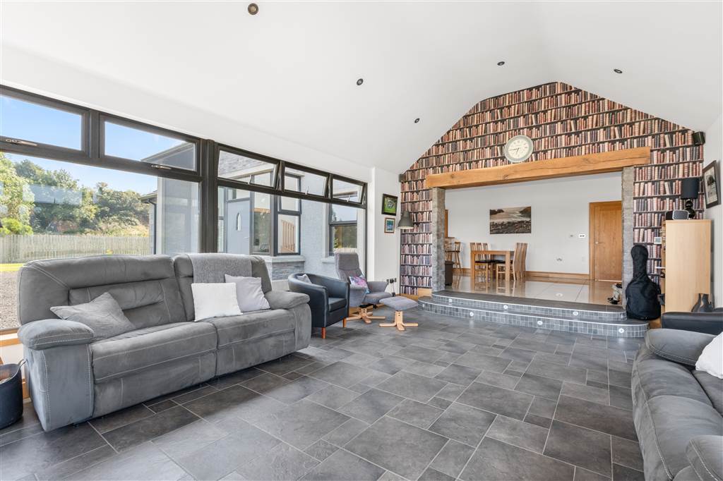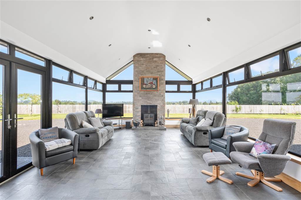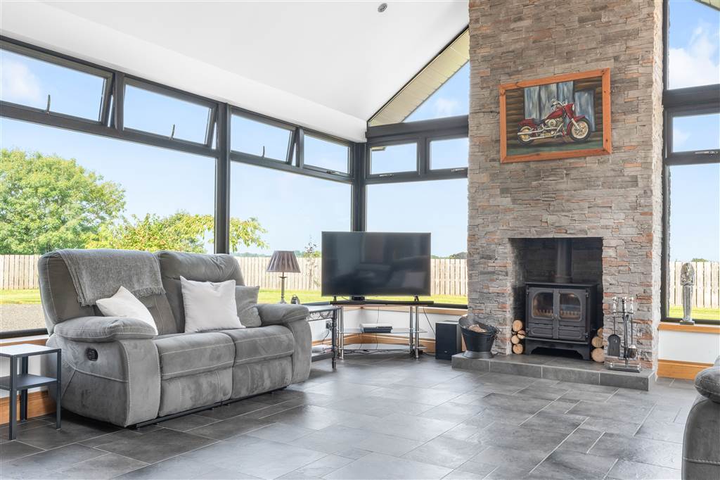 With multi-fuel burning stove (back boiler) to tiled hearth and cladded surround. Vaulted ceiling. Spot lighting to ceiling. Tiled flooring. PVC double doors leading outside.
