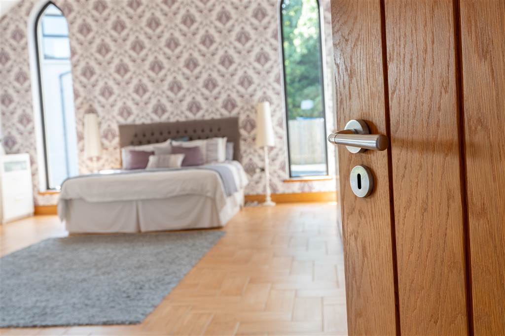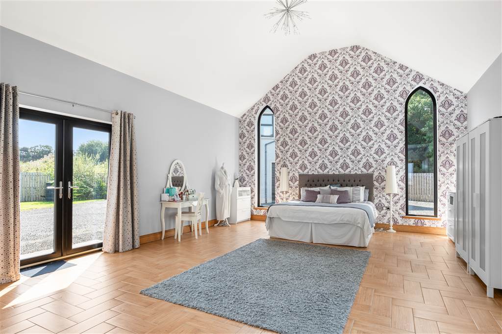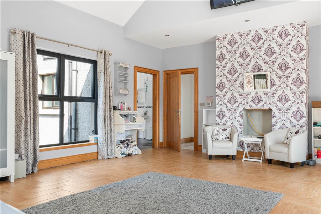 With en-suite bathroom and walk-in wardrobe. Fireplace (piped also for gas fire). Vaulted ceiling. Floor to ceiling windows. Spot lighting to ceiling. Tiled flooring. PVC double doors leading outside.