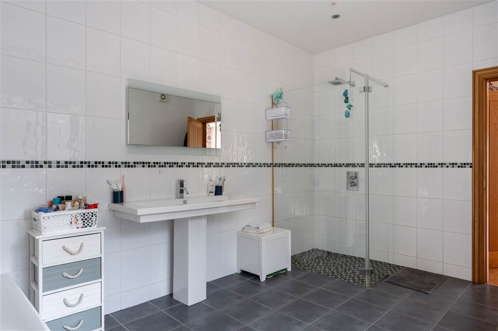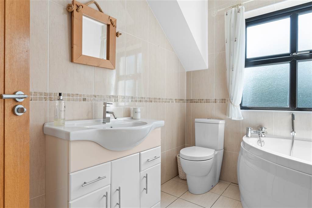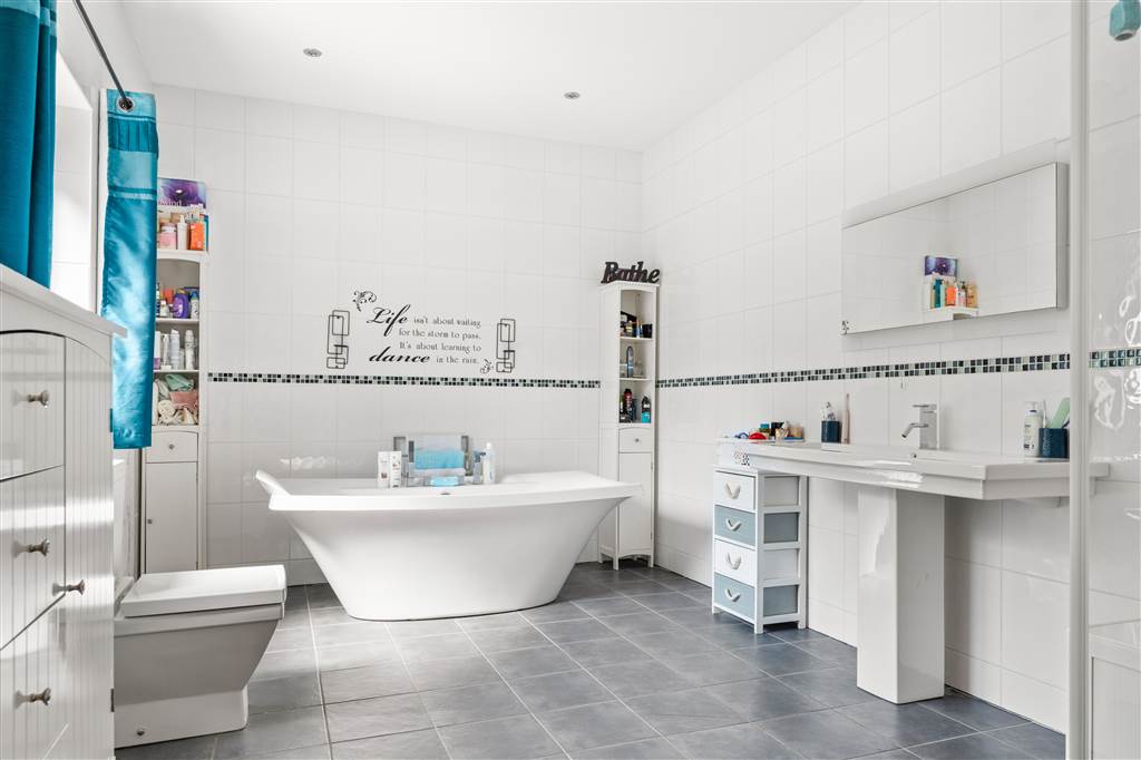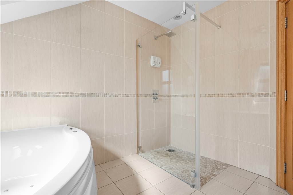 With 4-piece white suite comprising LFWC, WHB, free-standing bath and power shower to tiled corner cubicle. Spot lighting to ceiling. Tiled walls. Tiled flooring.