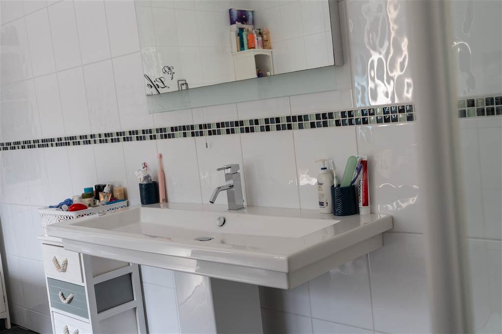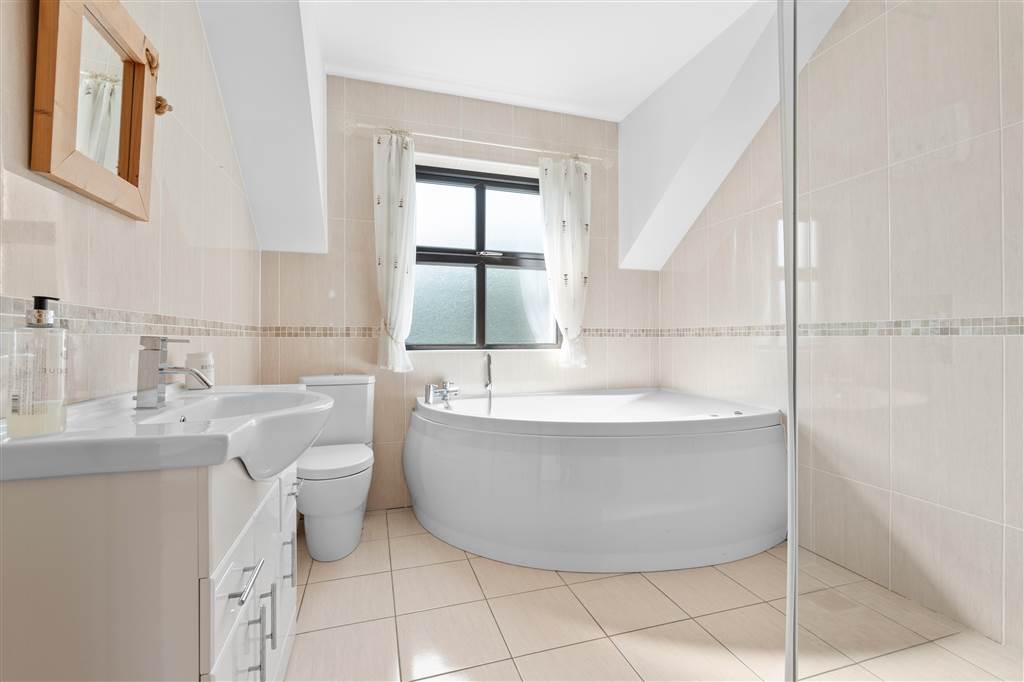 With 4-piece white suite comprising LFWC, WHB with built-in vanity unit, corner jacuzzi bath with hand-held shower head and shower to enclosed tiled cubicle. Tiled walls. Tiled flooring.