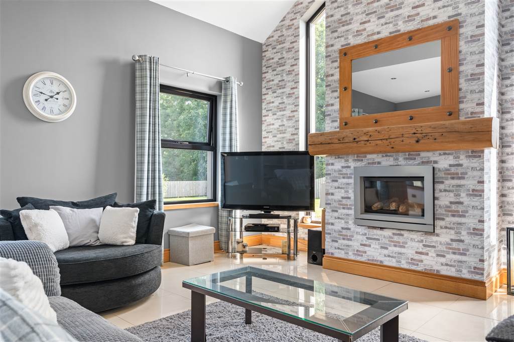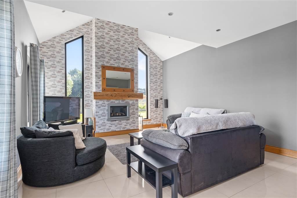 With wall-mounted gas fire with railway sleeper style mantle. Vaulted ceiling. Floor to ceiling windows. Spot lighting to ceiling. Tiled flooring.
