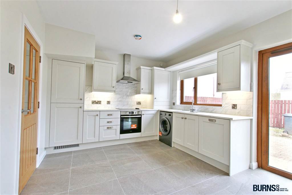 tiled floor; modern eye and low-level units; sink and drainer; electric oven, grill and hob with stainless steel extractor hood; integrated fridge/freezer; integrated dishwasher; washing machine; TV point; double doors to fully enclosed rear yard.