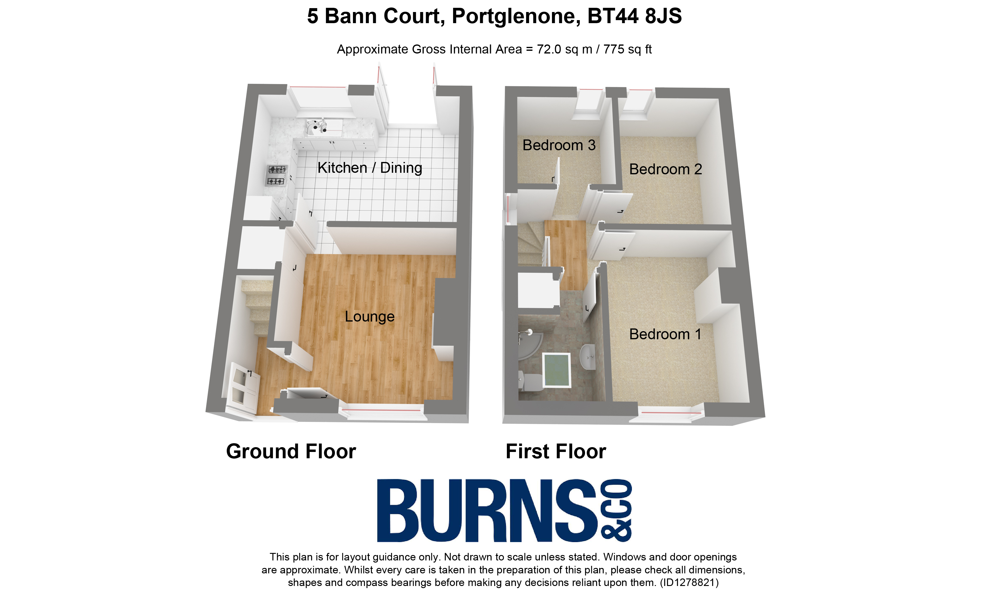 Recently modernised three bedroom semi detached dwelling in the small and exclusive Bann Court development in the heart of Portglenone.