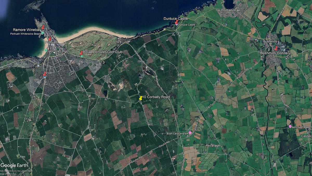 Passing the Mill Strand Integrated School on the Ballywillan Road in Portrush, you will come to a crossroads with a church and graveyard on your right hand side. Proceed through these crossroads and the Corbally Road will be the second road on the left. Proceed along this road and No. 10 will be on your right hand side before you come on to the Ballyhome Road.
