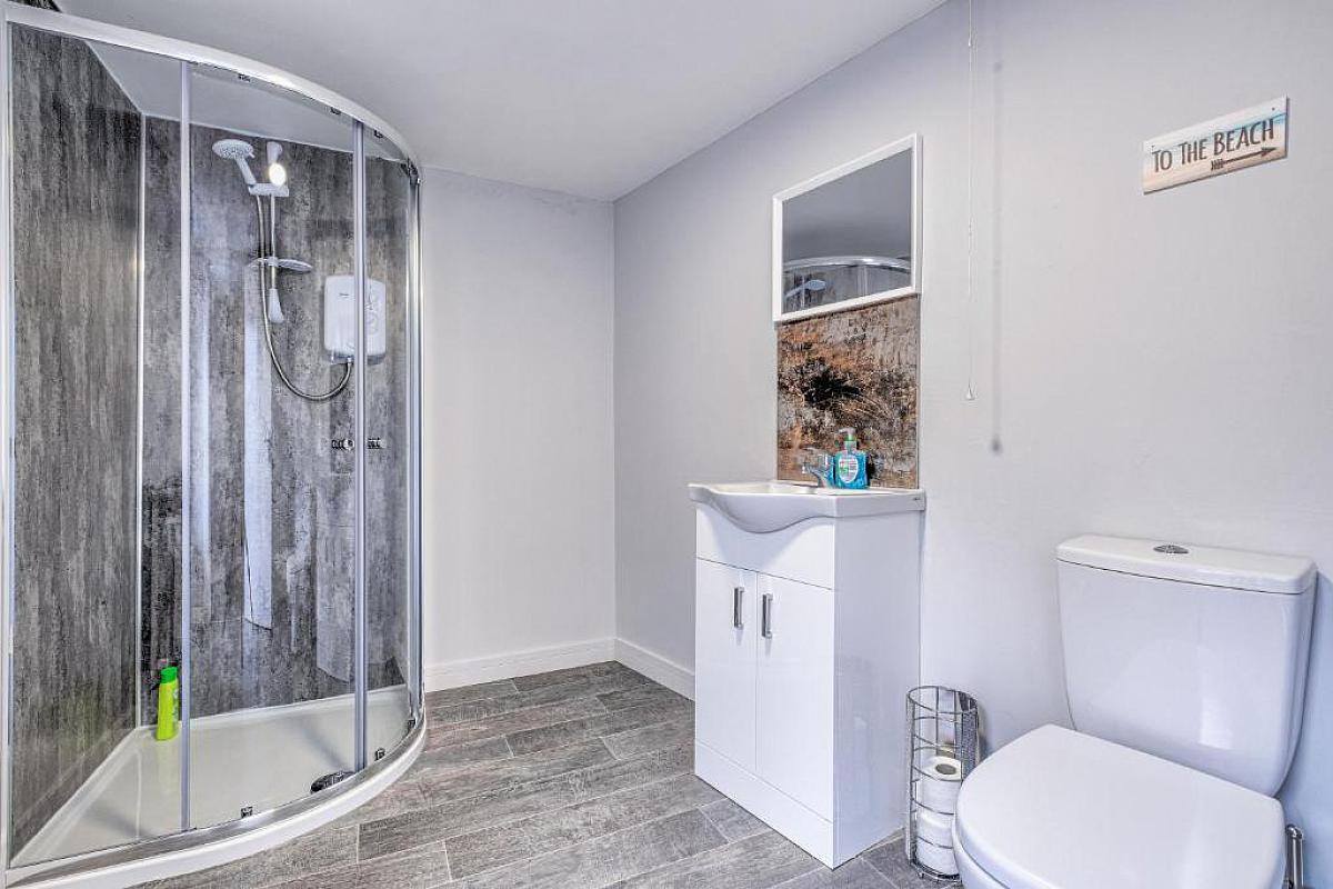 With white suite comprising w.c., wash hand basin set in vanity unit and PVC cladded splashback, PVC cladded walk in shower cubicle with electric shower and extractor fan.