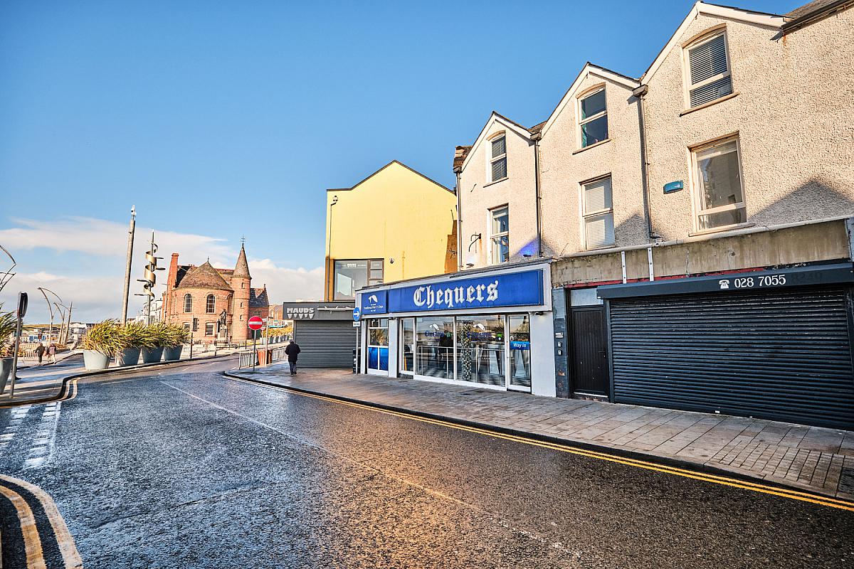 Approaching Portrush Town Centre on the Coleraine Road continue through the mini-roundabout taking the second exit onto Eglinton Street. Travel along the street until you reach the Eglinton hotel and turn right. Immediately on your left hand side is chequers chip shop and the entrance to this apt is the door on the right hand side.