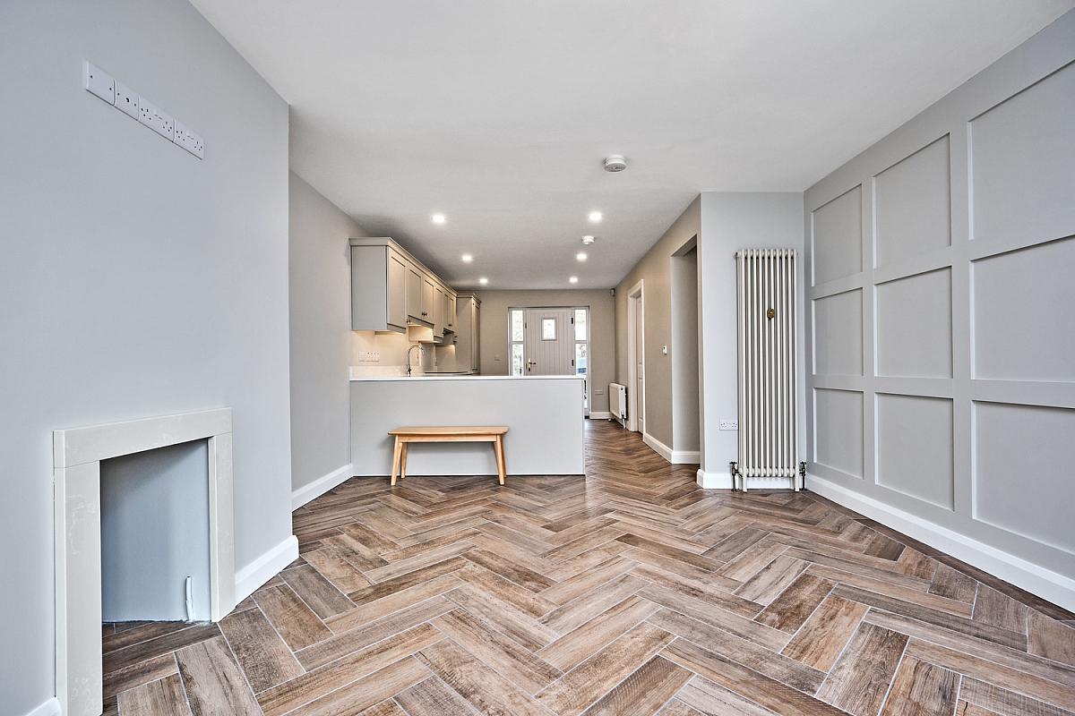 With recess for gas fire, part wood panelled walls and herringbone tiled floor.