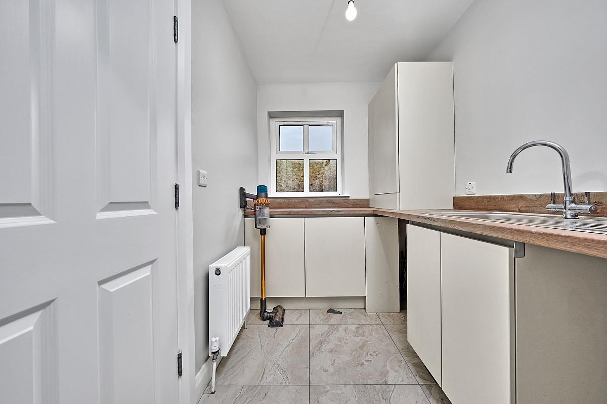 With single drainer stainless steel sink unit, low level units, integrated washing machine and tumble dryer and tiled floor.