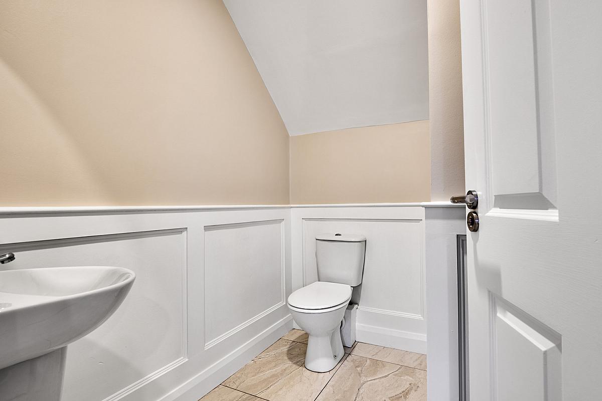 Ensuite off with w.c., wash hand basin with tiled splashback with illuminated shelf and mirror above, fully tiled walk in shower cubicle with rainfall mains shower head, additional telephone hand shower, recessed lighting, extractor fan and tiled floor.