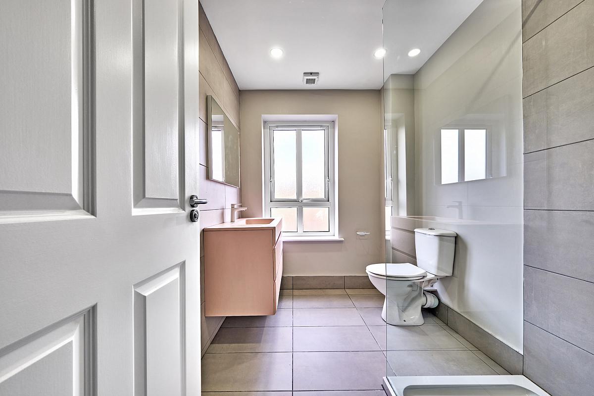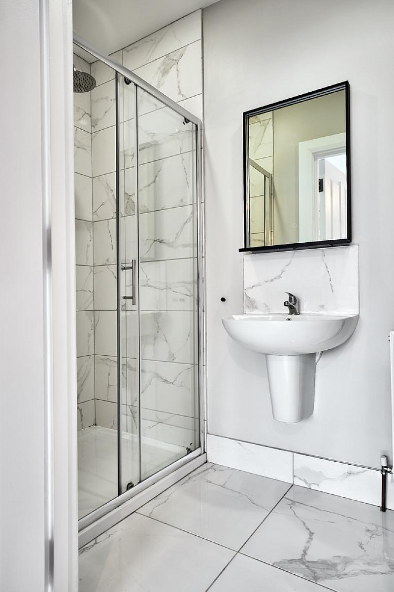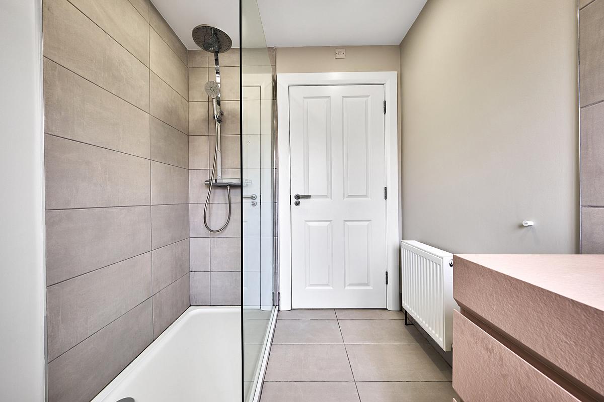 With white suite comprising w.c., wash hand basin set in vanity unit with storage below, fully tiled walk in shower cubicle with rainfall shower head, additional telephone hand shower, recessed lighting, extractor fan and tiled floor.