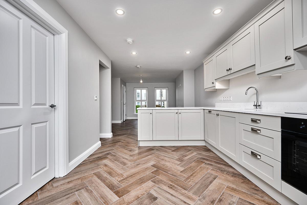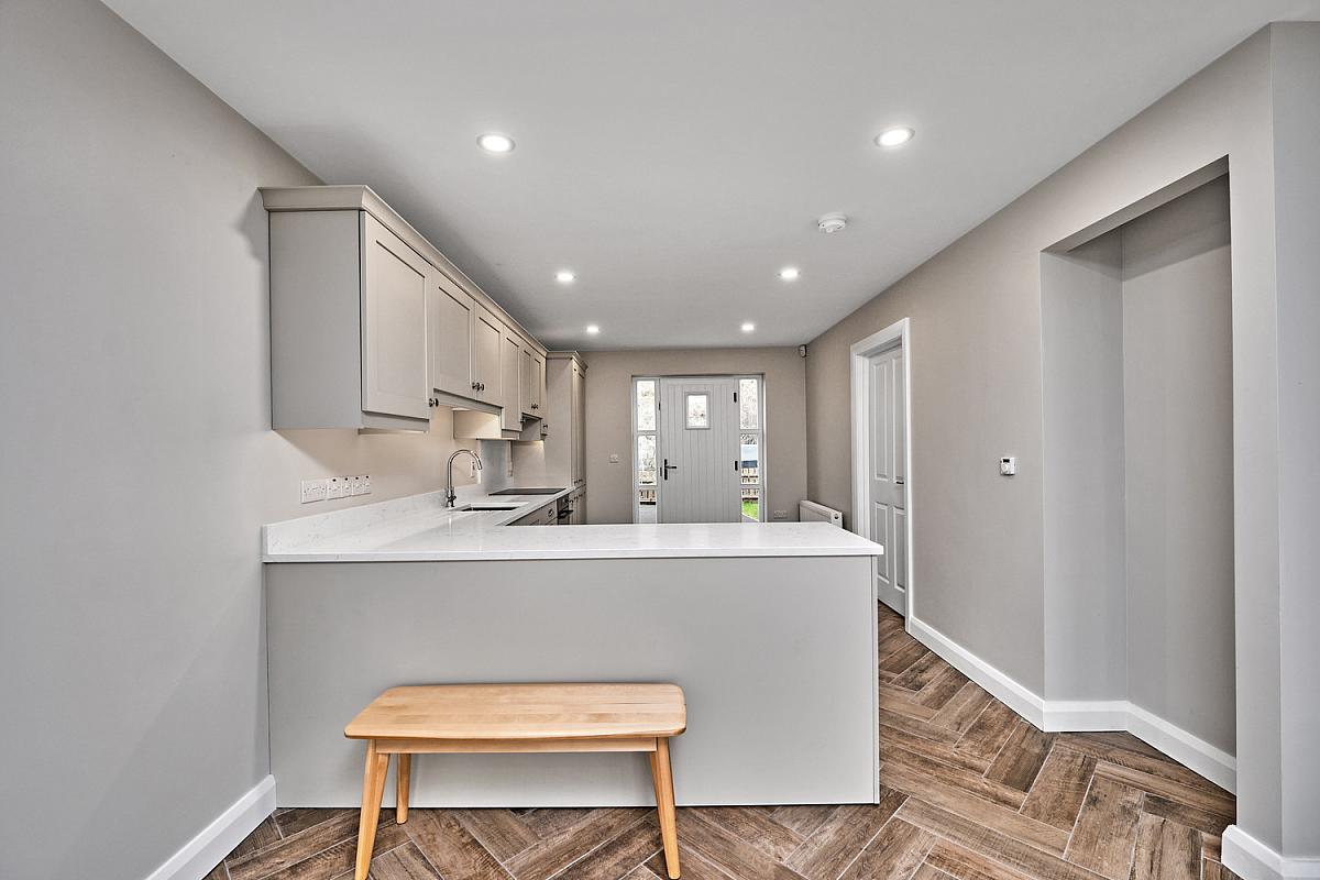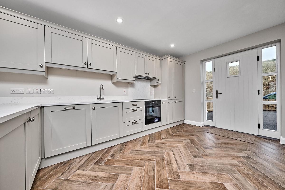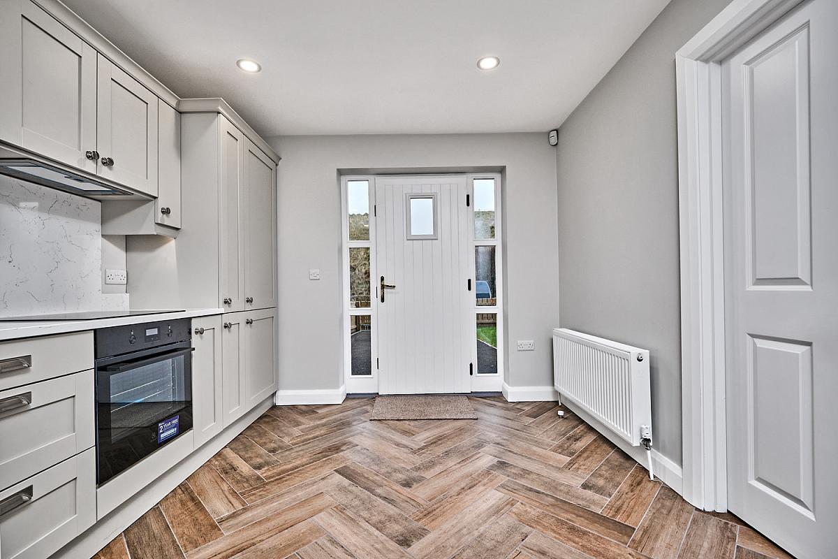 With single drainer stainless steel sink unit, range of high and low level units, granite worktops, breakfast bar, upstands, integrated fridge freezer, ceramic hob, oven, extractor fan, dishwasher, saucepan drawers, recessed lights, herringbone tiled floor and pedestrian door leading to rear garden.