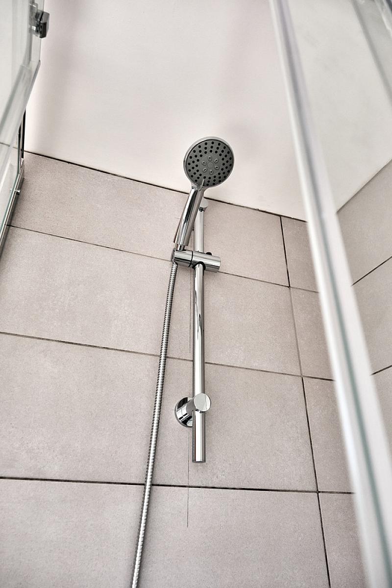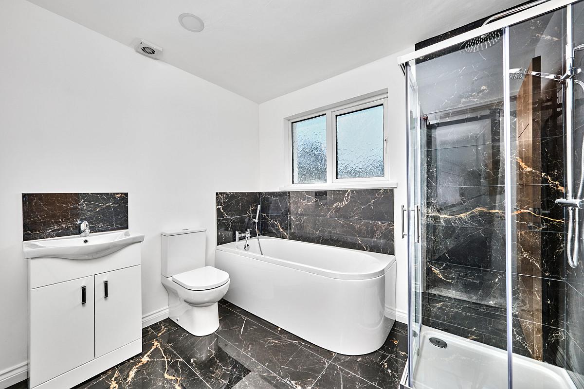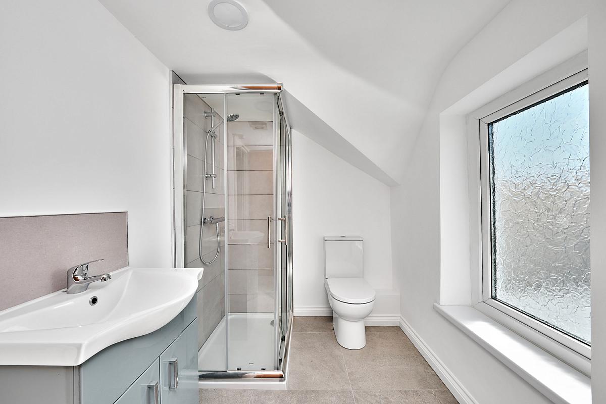 With white suite comprising w.c., wash hand basin with tiled splashback, fully tiled walk in shower cubicle with mains shower, recessed lighting, extractor fan and tiled floor.