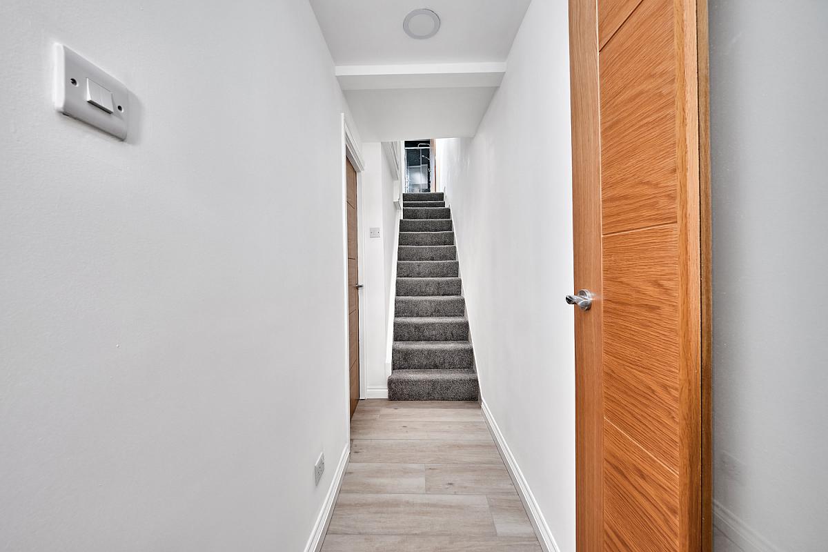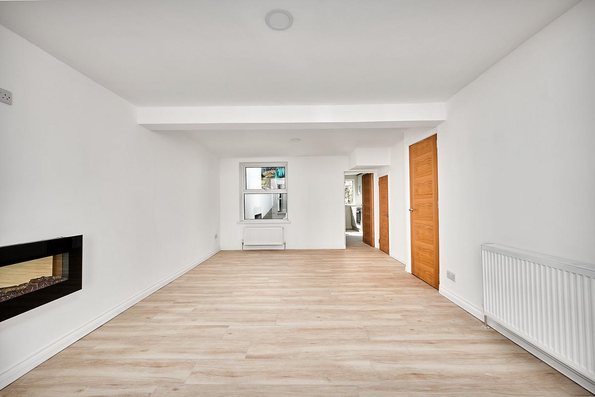 With electric wall-mounted remote controlled fire, recessed lighting, understairs storage cupboard and porcelain tiled floor.