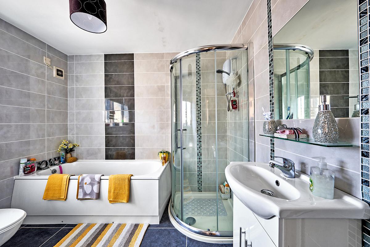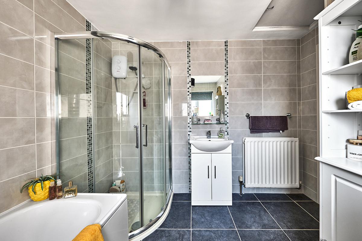 With white suite comprising w.c., wash hand basin with storage below, fully tiled walk in shower cubicle with electric shower, bath, fully tiled walls, extractor fan and tiled floor.