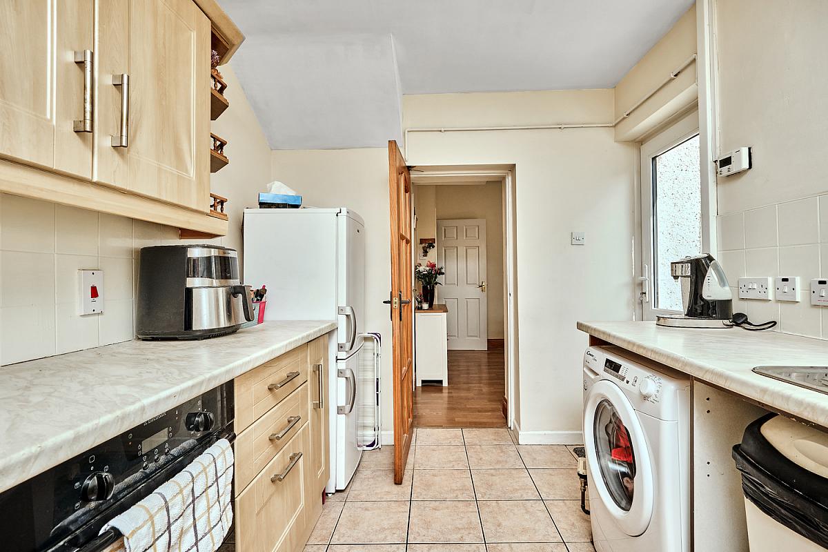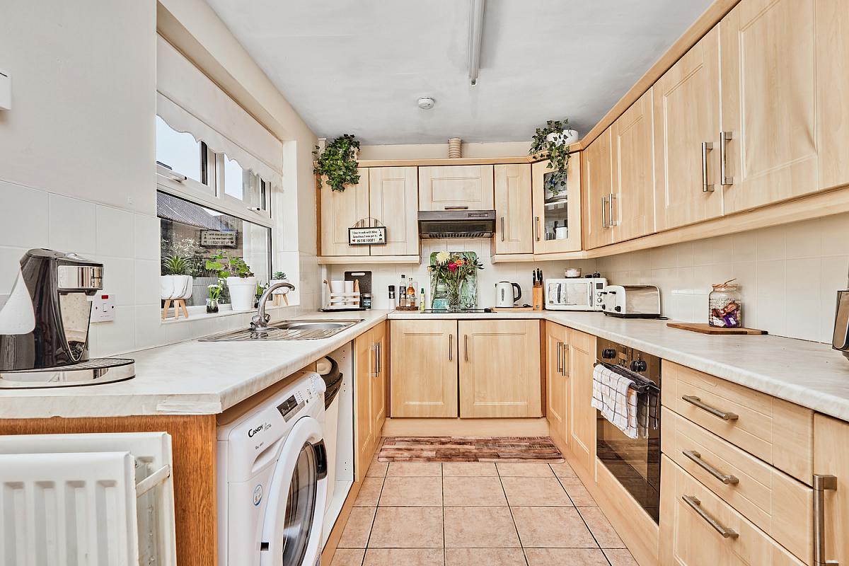 With single drainer stainless steel sink unit, high and low level built in units with tiling between, integrated ceramic hob, oven with extractor fan above, space for fridge freezer, glass display cabinets, shelving, saucepan drawers, plumbed for automatic washing machine, space for tumble dryer, stirp lighting, tiled floor and pedestrian door leading to rear yard.