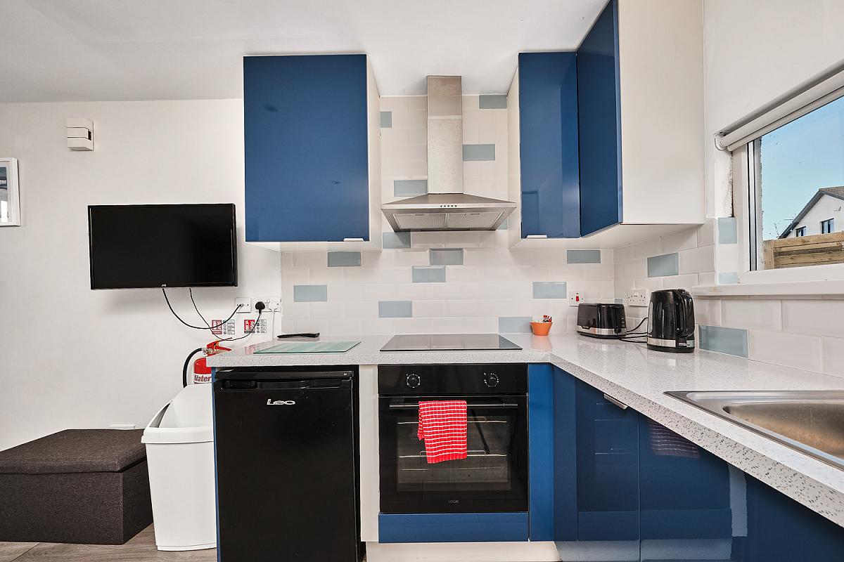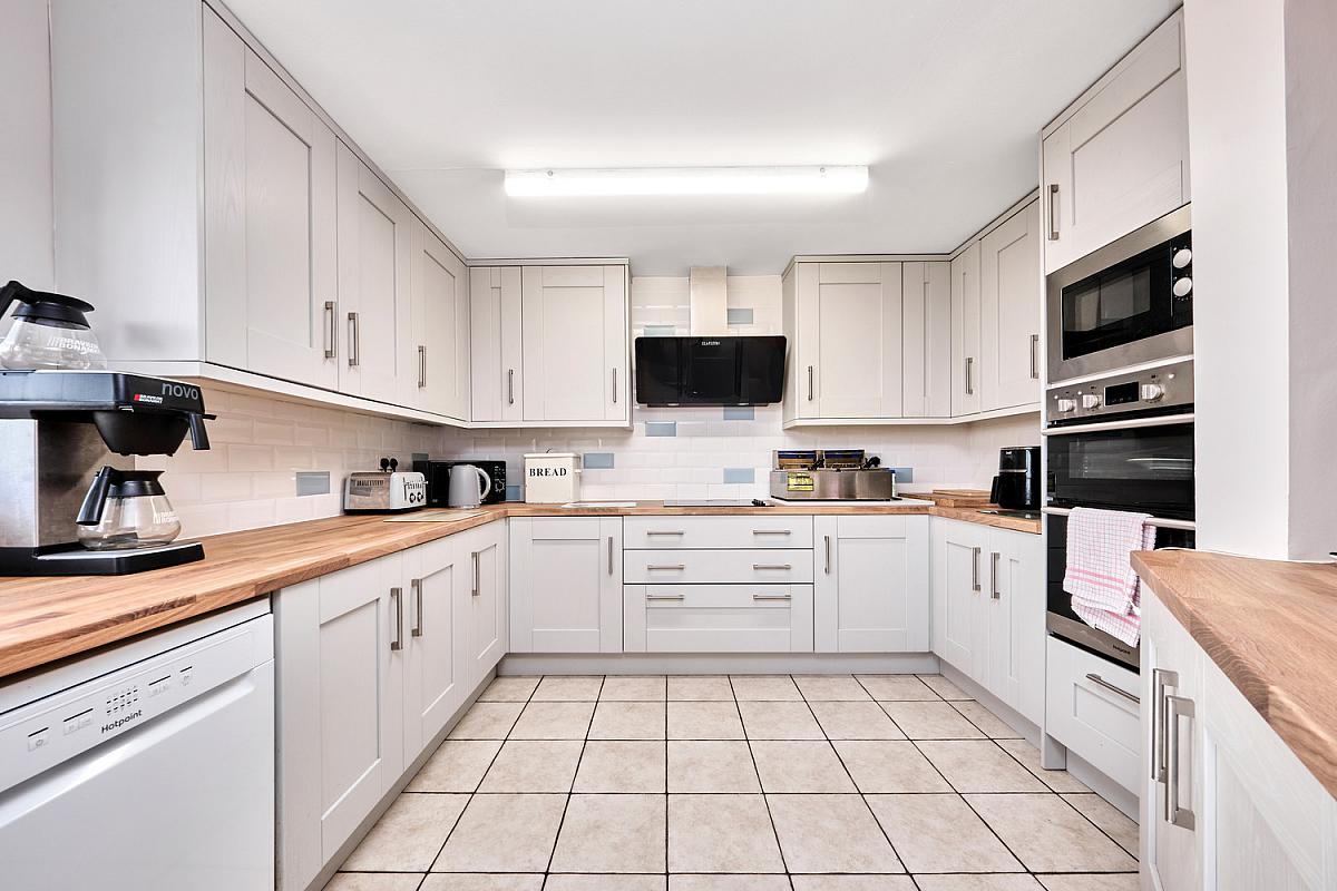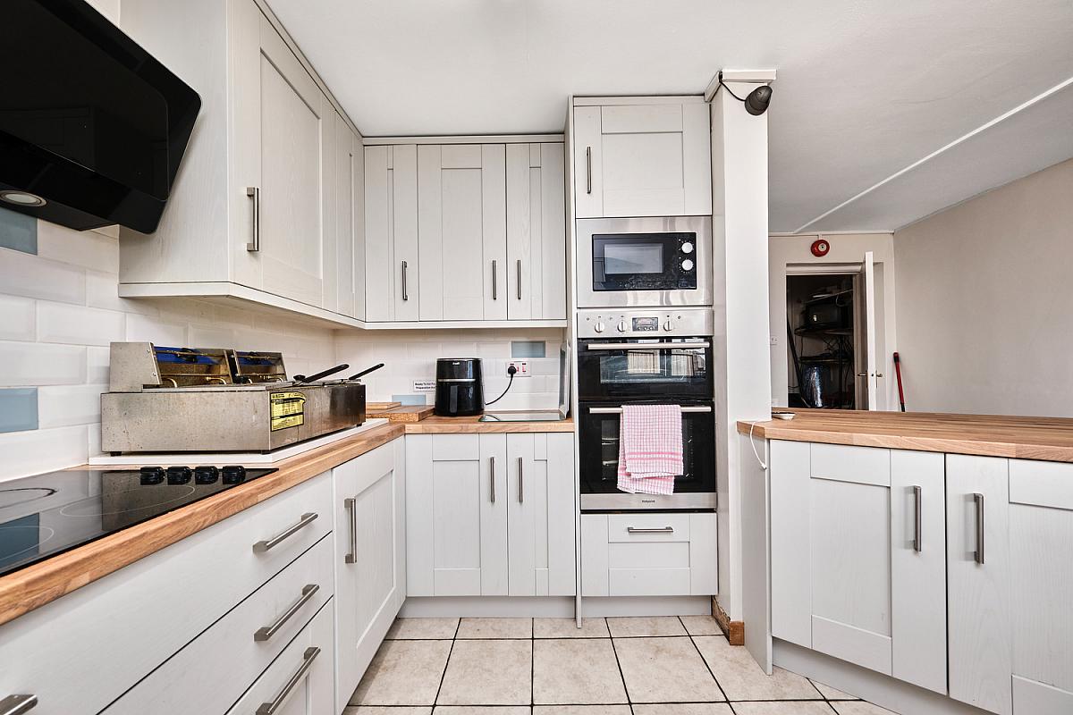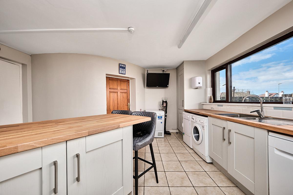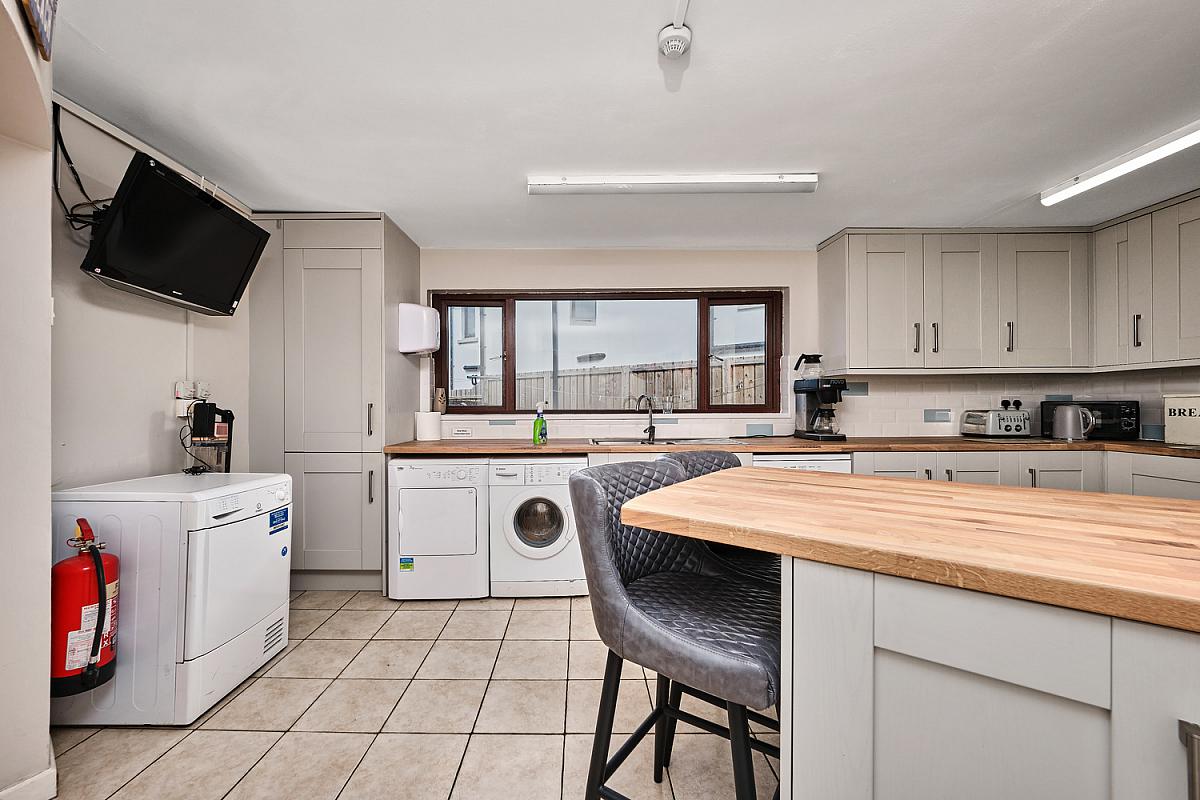With bowl and a half single drainer stainless steel sink unit, high and low level units with tiling between, integrated ceramic hob, 'Klarstein extractor hood above, double eye level 'Hotpoint' ovens, integrated microwave, integrated fridge freezer, plumbed for dishwasher and washing machine, vented for tumble dryer, saucepan drawers, breakfast bar with seating and storage below, strip lighting and tiled floor. (L-Shaped)