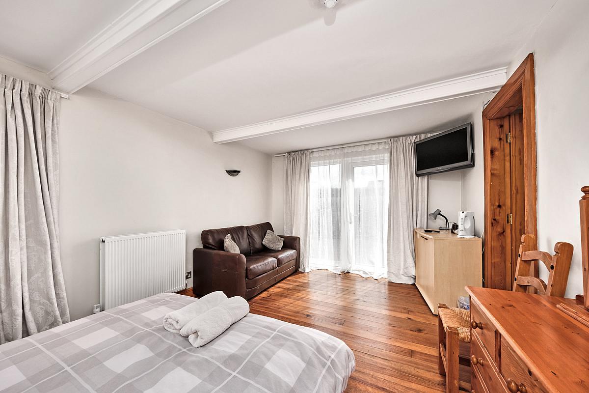 With solid wood floor, feature wood beam ceiling, wiring for wall lights and PVC French doors leading to rear garden.
