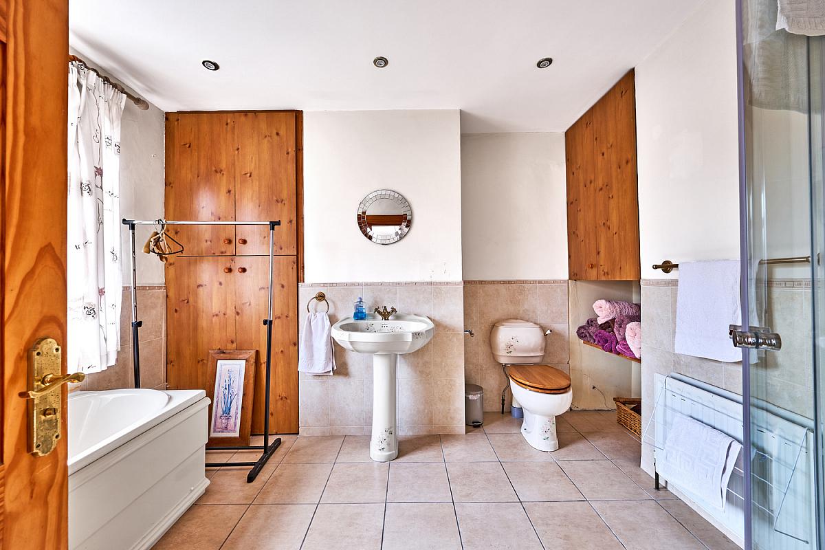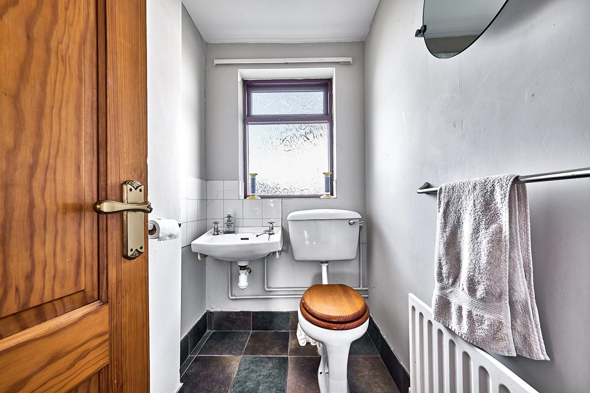 With w.c. and wash hand basin with tiled splashback and tiled floor.