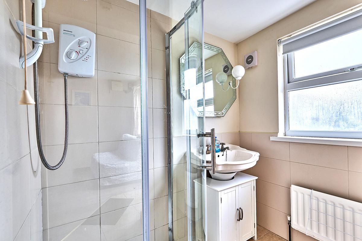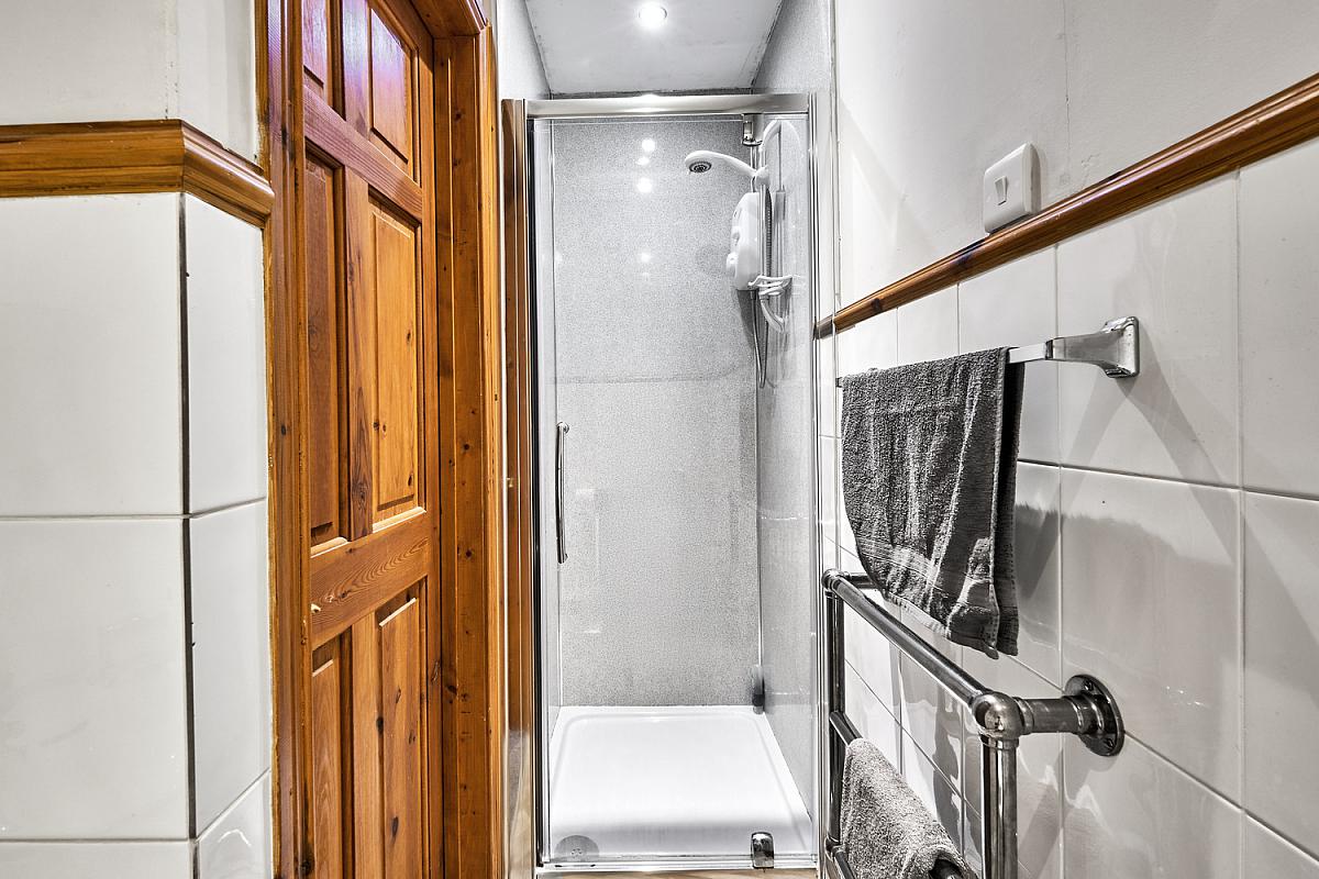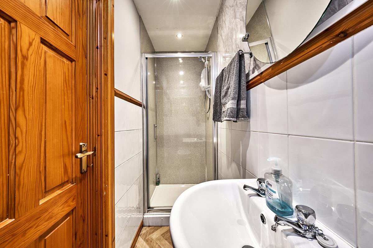 With fully tiled walk in shower cubicle with electric shower, w.c., wash hand basin, half tiled walls, mirror with light above, extractor fan, recessed lighting and tiled floor.
