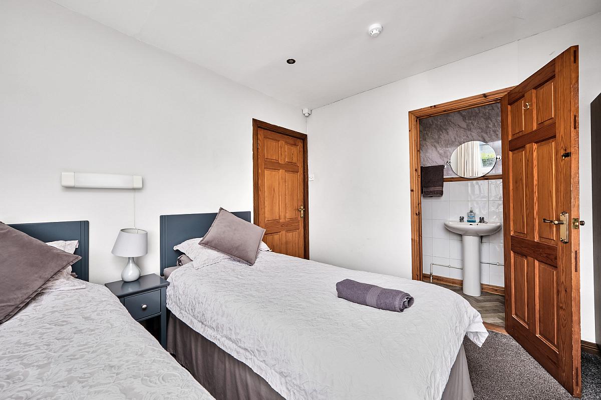 Ensuite off with w.c., wash hand basin set in vanity unit, bath with electric shower over, PVC cladded walls and recessed lighting.