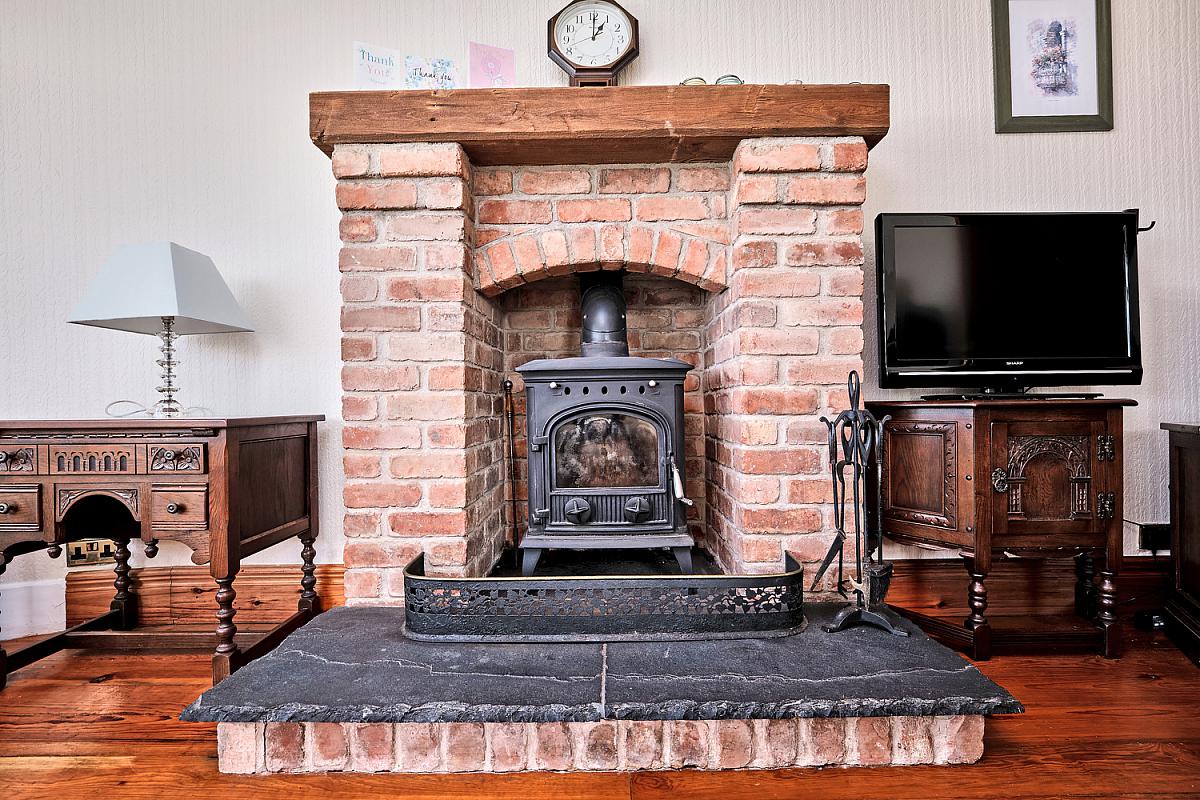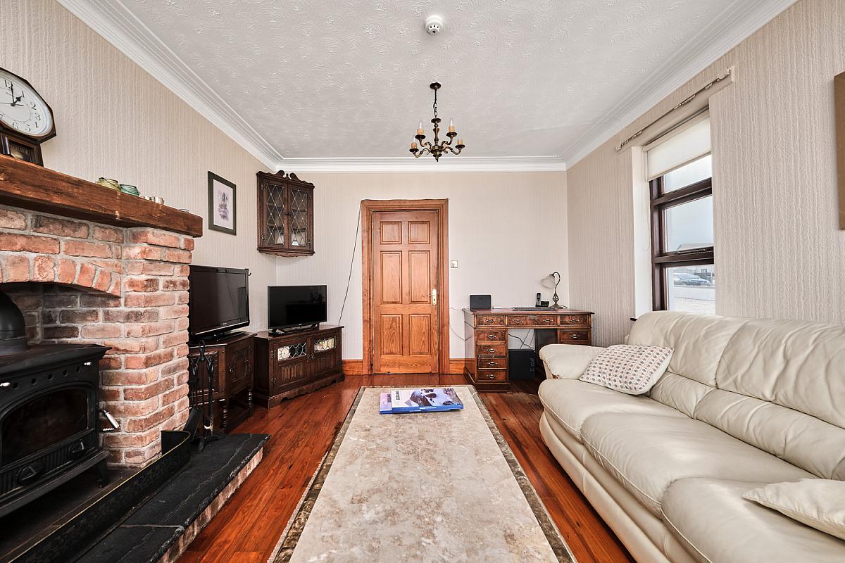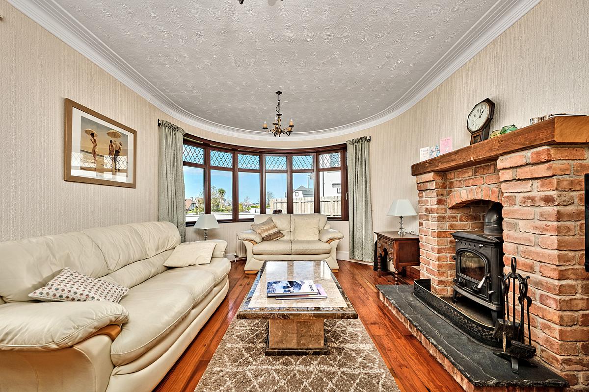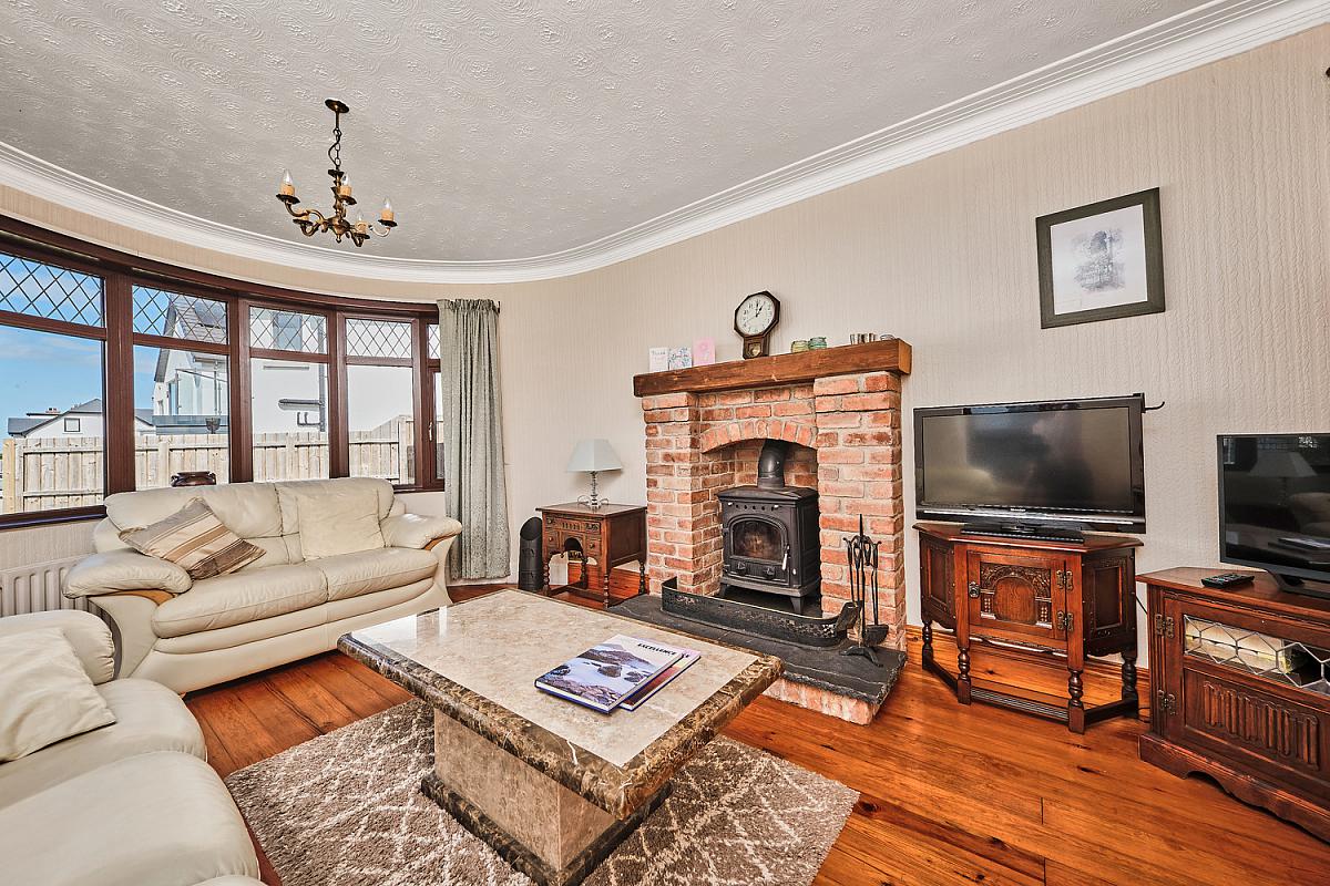 With brick surround fireplace with tiled inset and hearth, wiring for wall lights, feature curved window, cornicing and solid wood floor.