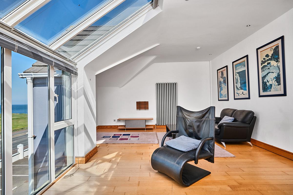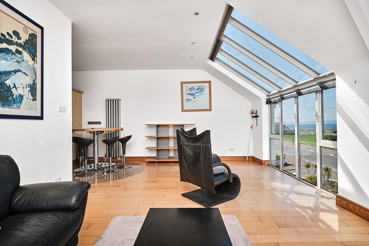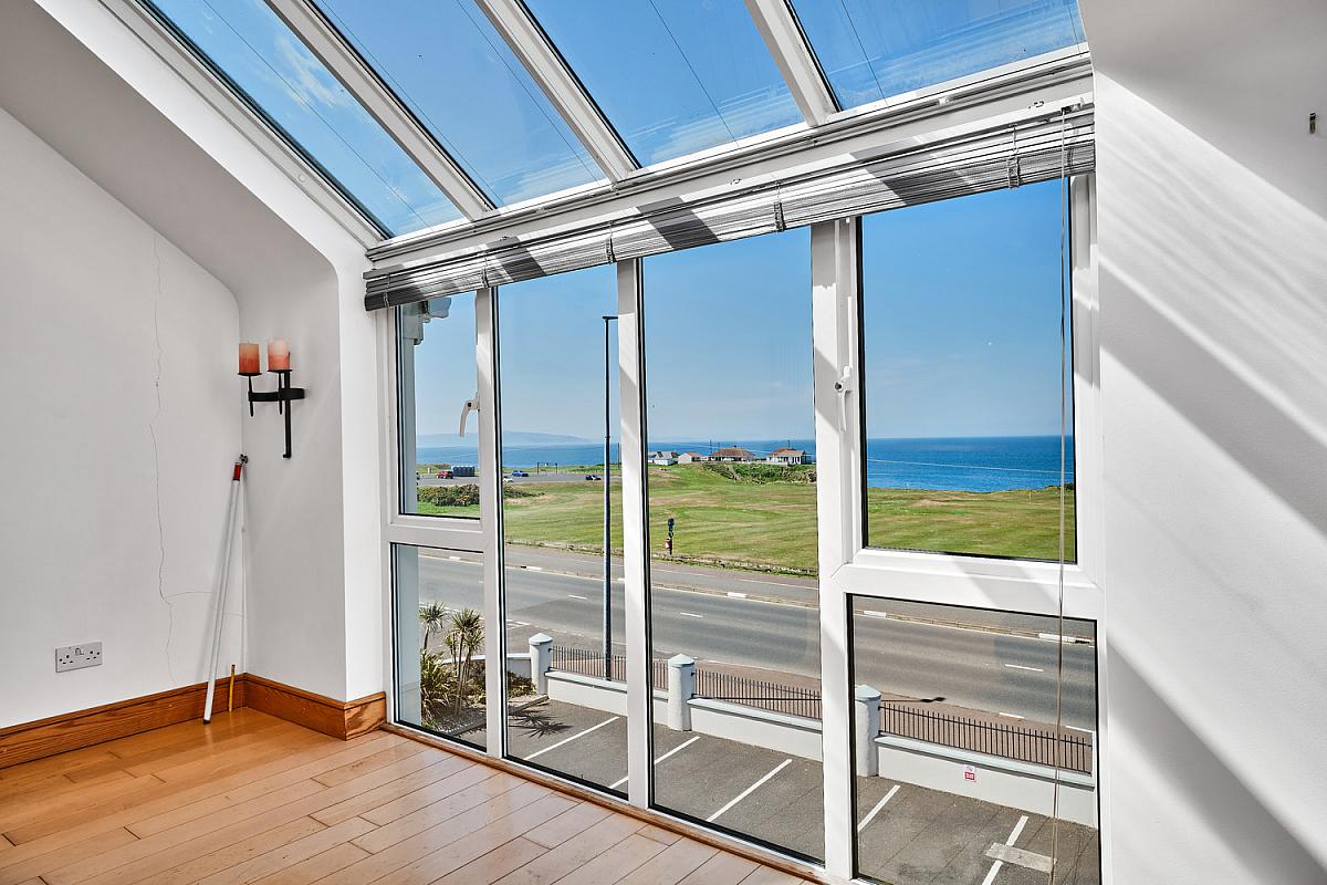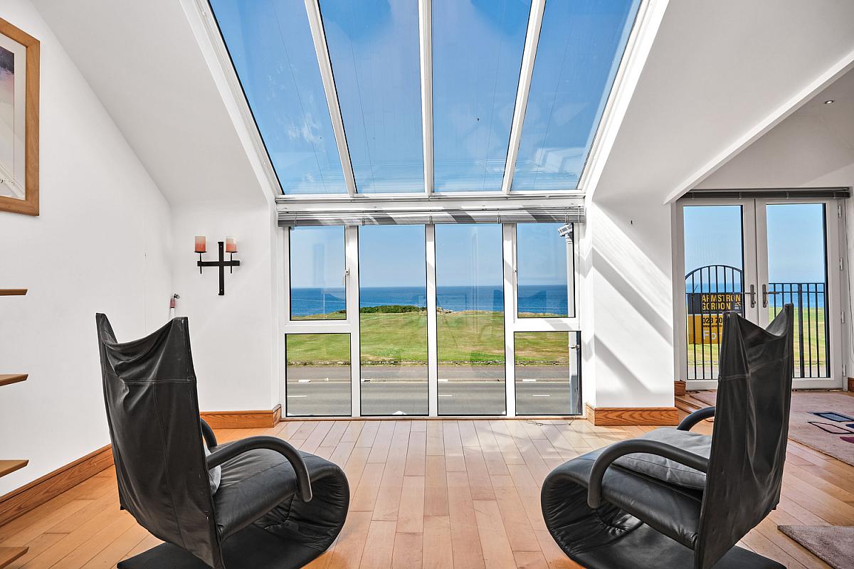 With patio door to balconette, partial glass roof, feature vertical radiator, laminate wood floor, recessed lighting and stunning views of sea, golf course and Donegal headlands.