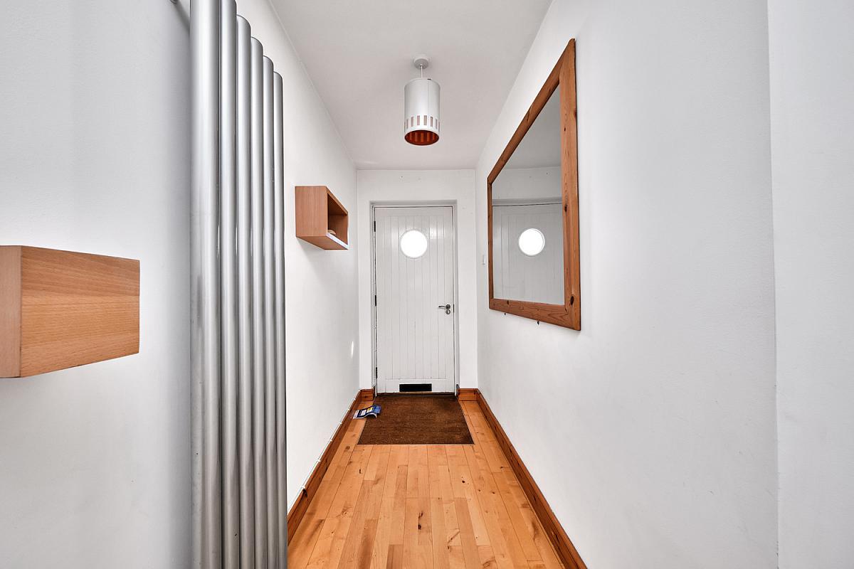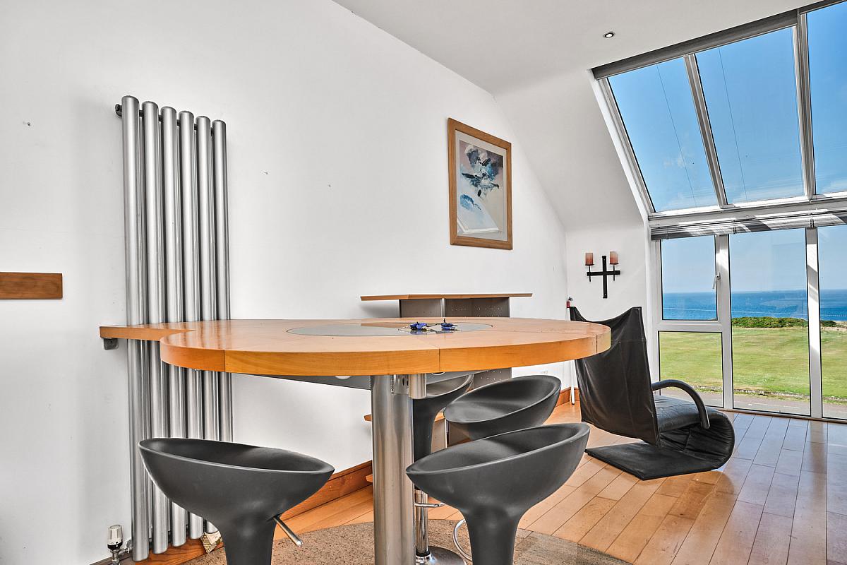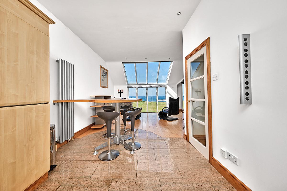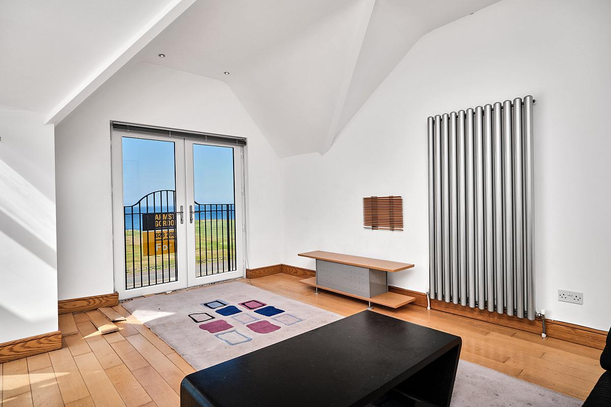 With patio door to balconette, partial glass roof, feature vertical radiator, laminate wood floor, recessed lighting and stunning views of sea, golf course and Donegal headlands.