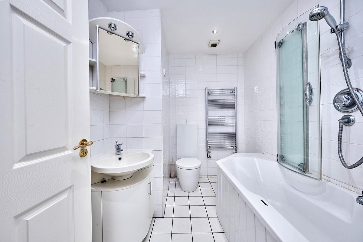 With white suite comprising W.C., wash hand basin with storage below, shower over bath, fully tiled walls, chrome towel rail, extractor fan, recessed lighting and tiled floor.