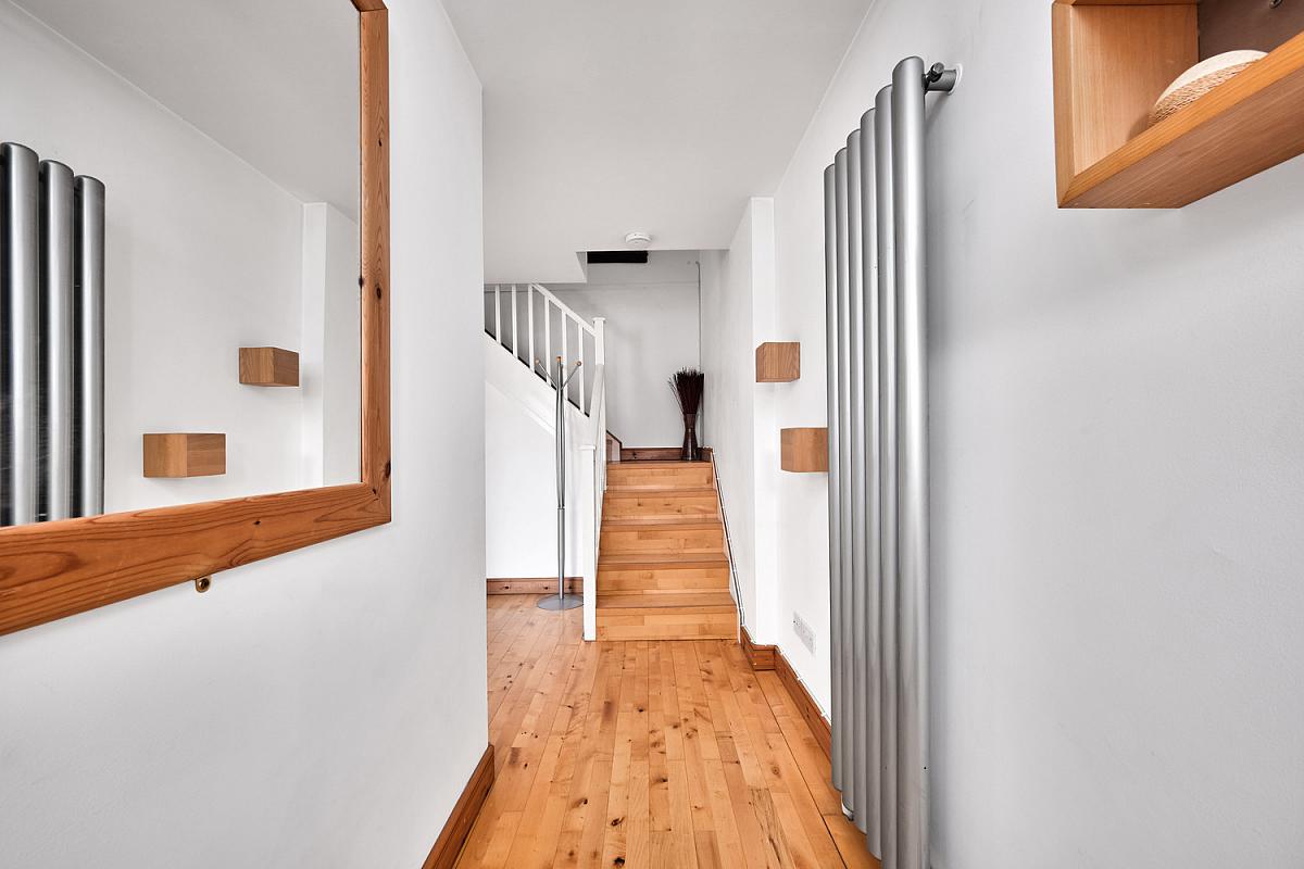 With under stairs storage cupboard, feature vertical radiator and laminate wood floor.