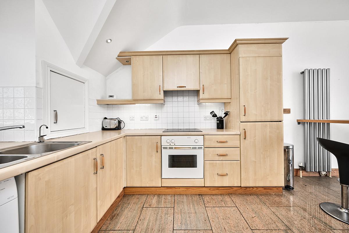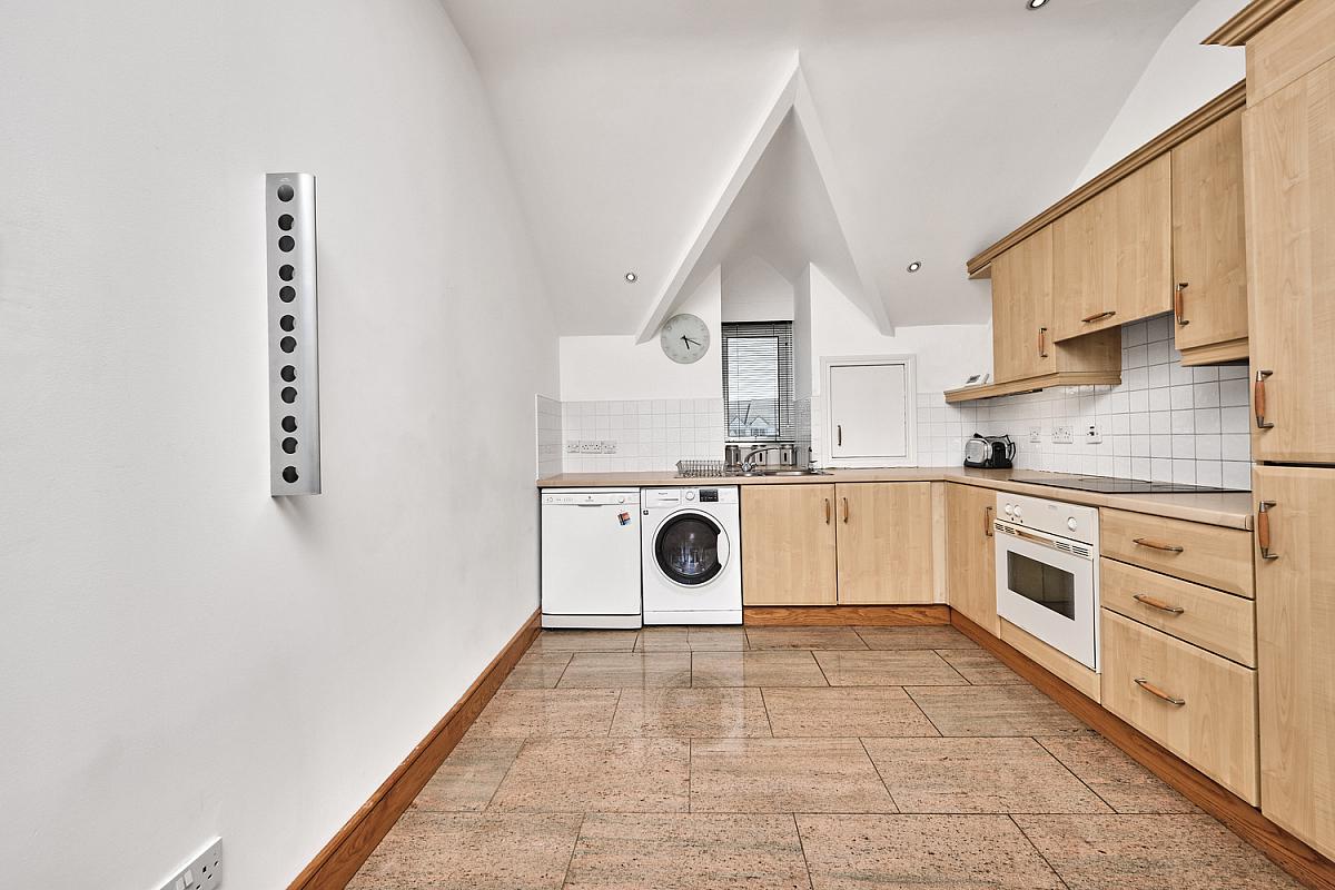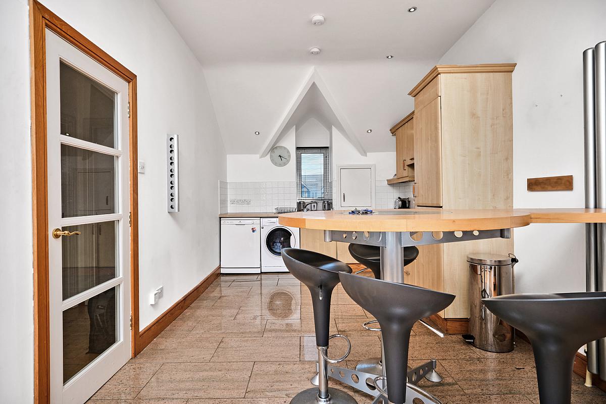 With bowl and a half stainless steel sink unit, high and low level built in units with tiling between, integrated oven, ceramic hob with extractor fan above, drawer bank, integrated fridge freezer, breakfast bar with seating below, plumbed for automatic dishwasher, integrated washing machine, feature vertical radiator, recessed lighting and tiled floor.