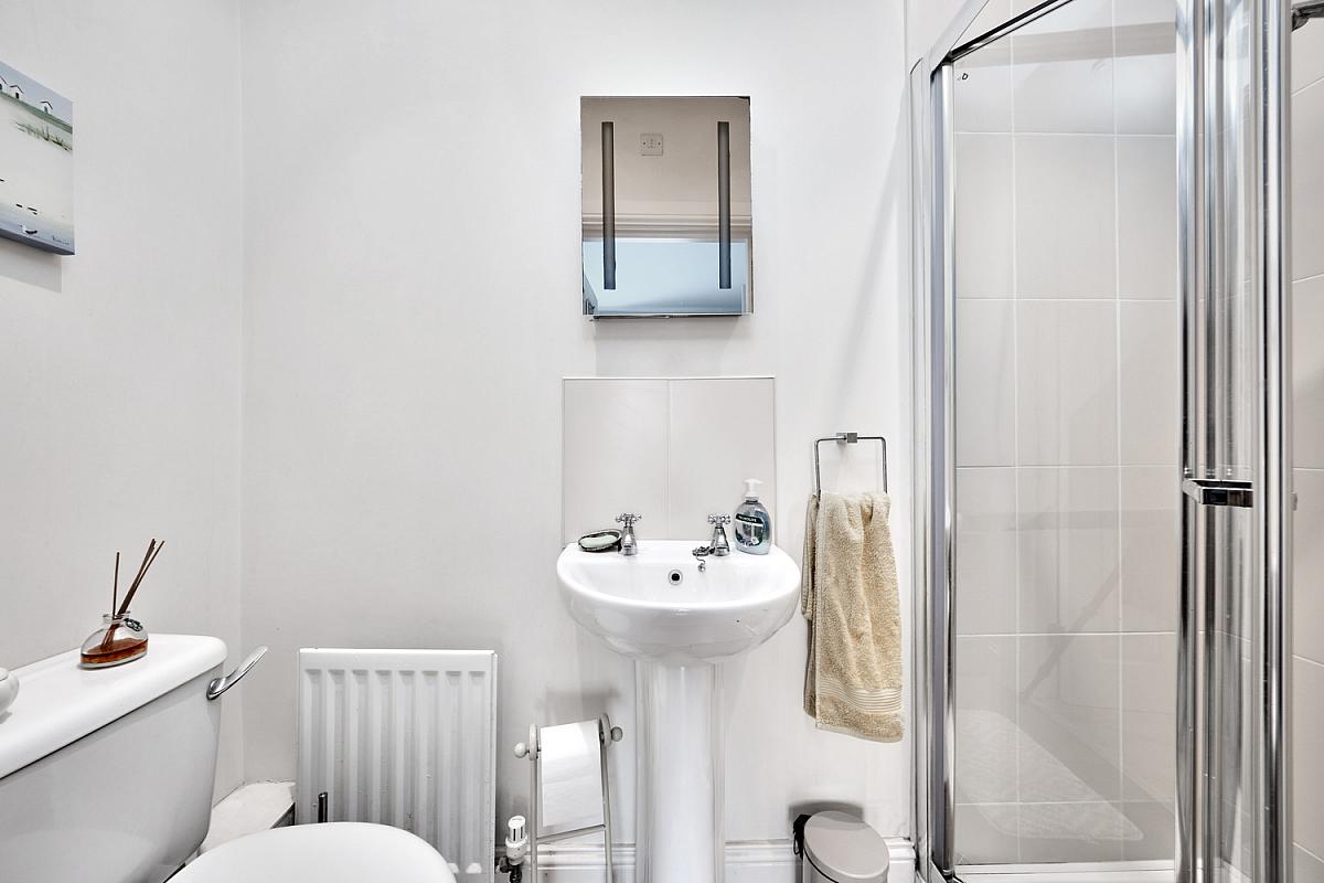 Off with w.c., wash hand basin with tiled splashback, fully tiled walk in shower cubicle with mains shower, extractor fan, recessed lighting and tiled floor.
