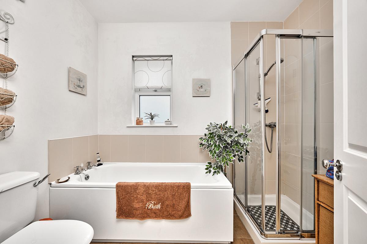 With white suite comprising w.c., wash hand basin with tiled splashback, fully tiled walk in shower cubicle with mains shower, tiled round bath, extractor fan, recessed lighting and tiled floor.