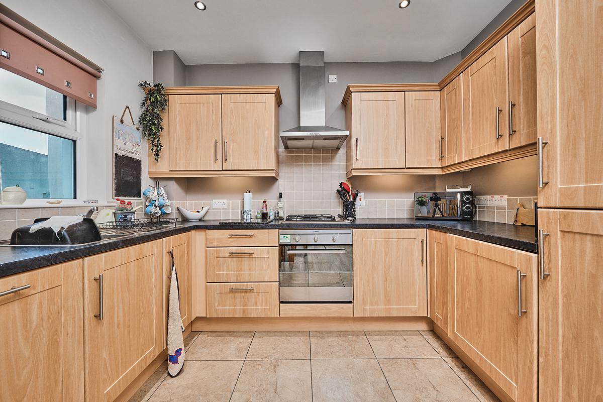 With single drainer stainless steel sink unit, high and low level units with tiling between, integrated gas hob, stainless steel oven and extractor fan, integrated fridge freezer and dish washer, washing machine, saucepan drawers, recessed lighting and tiled floor.