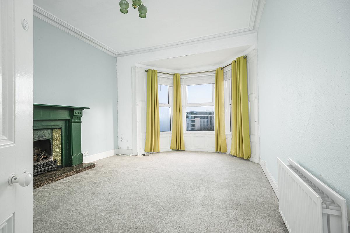 With wood surround fireplace with tiled inset and hearth, picture rail, wired for wall lights, storage surrounding bay window, cornicing, ceiling rose and solid wood floor. (into bay)