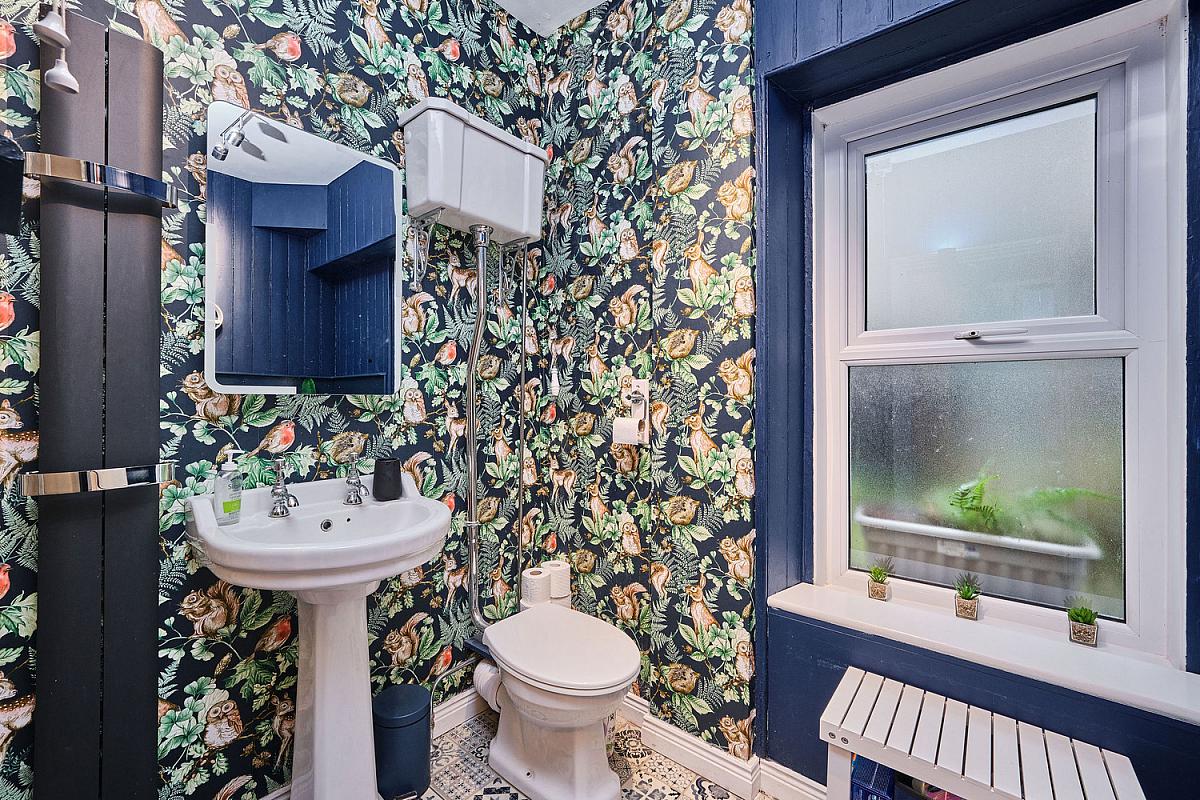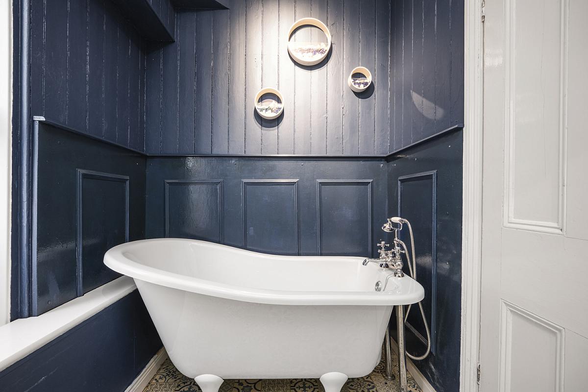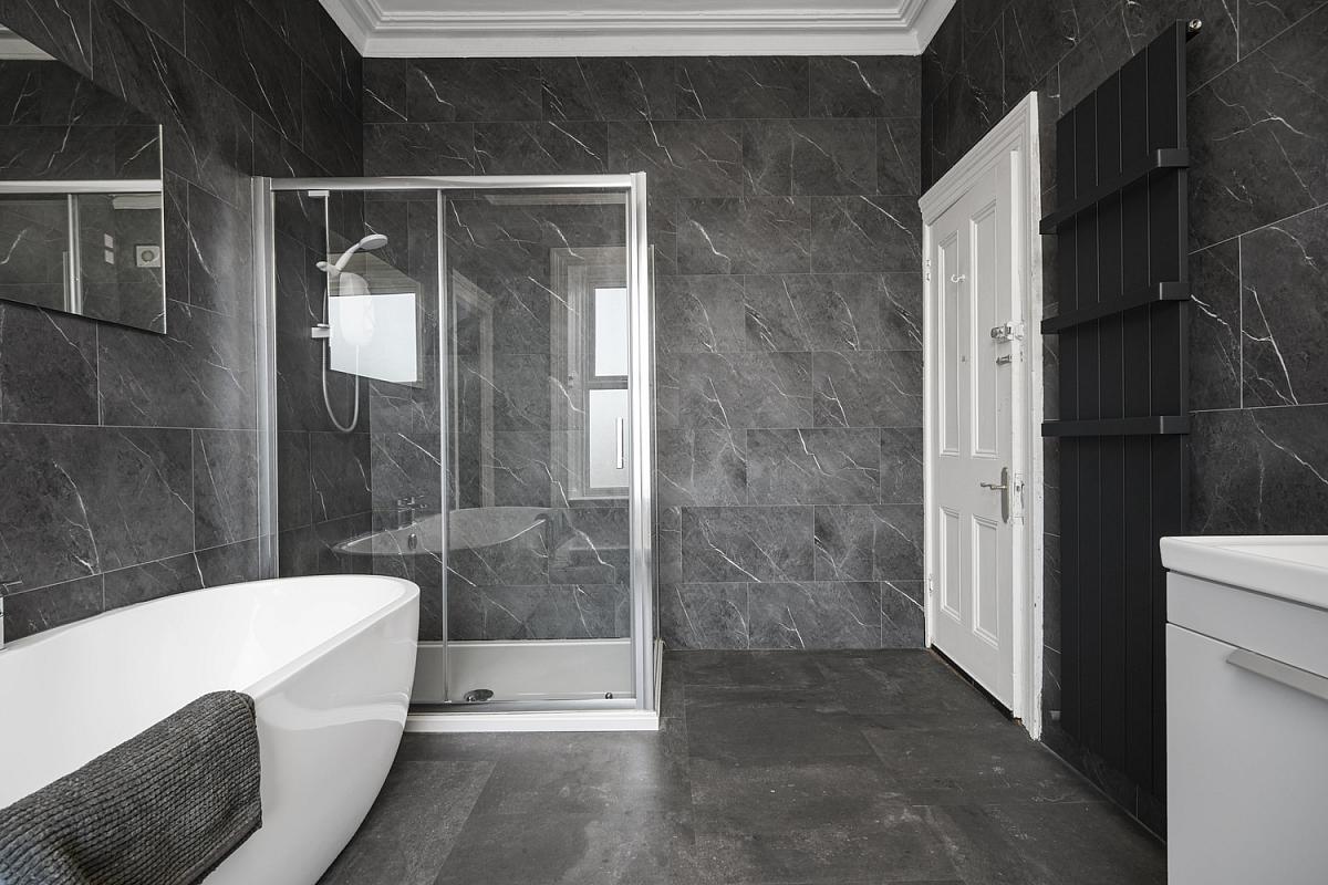 With white suite comprising high level flush w.c., wash hand basin, fully tiled walk in shower cubicle with electric shower, free standing bath with telephone hand shower, black matt heated towel rail and part wood panel walls.