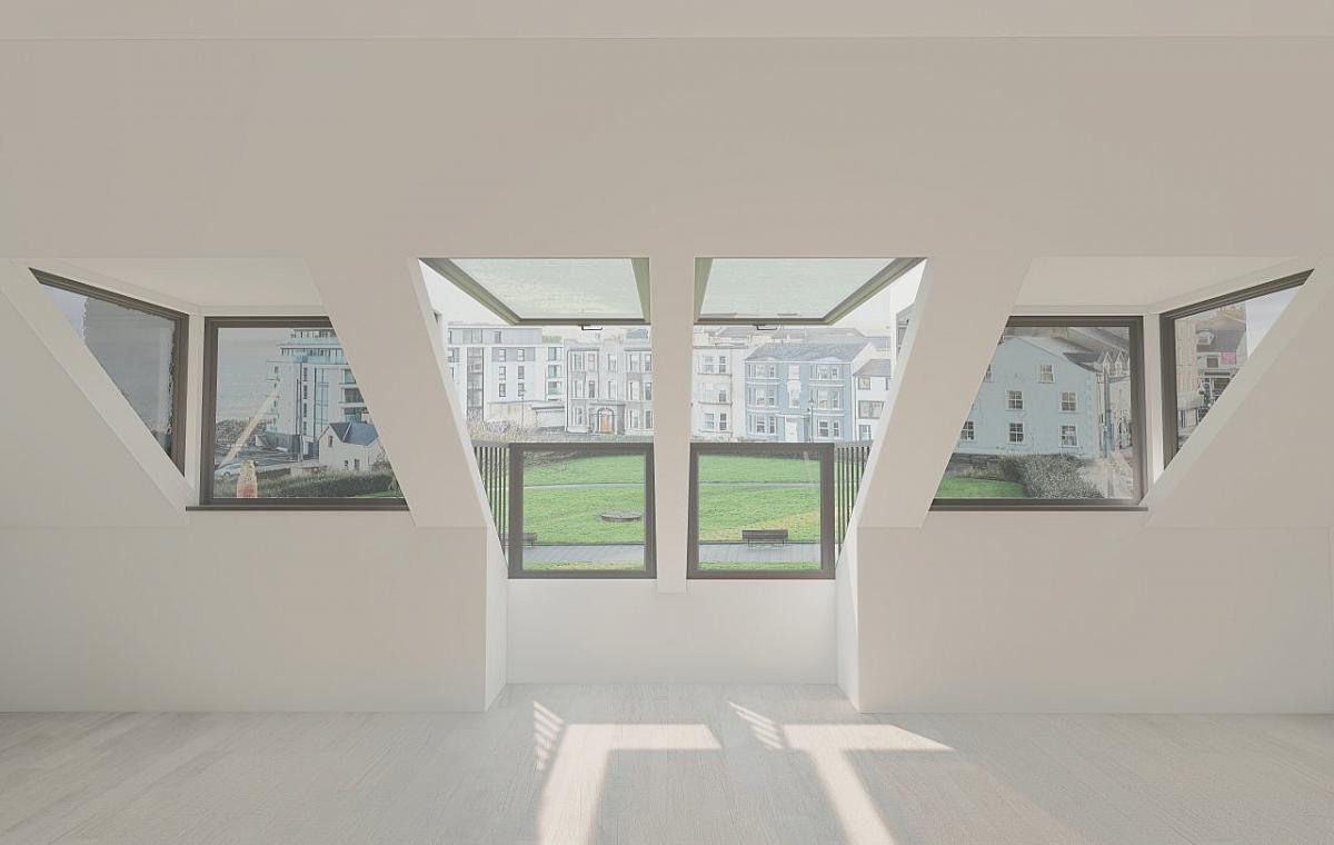 With cornicing and view of Atlantic Ocean, Skerries and Antrim Gardens.