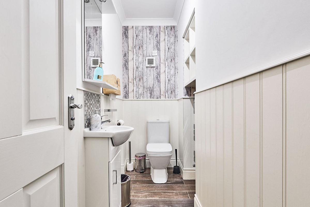 With half panelled walls, vanity basin, close-coupled w.c., heated towel rail, tiled floor, integrated mirror, integrated shelving and extractor fan.