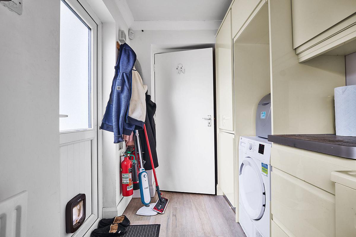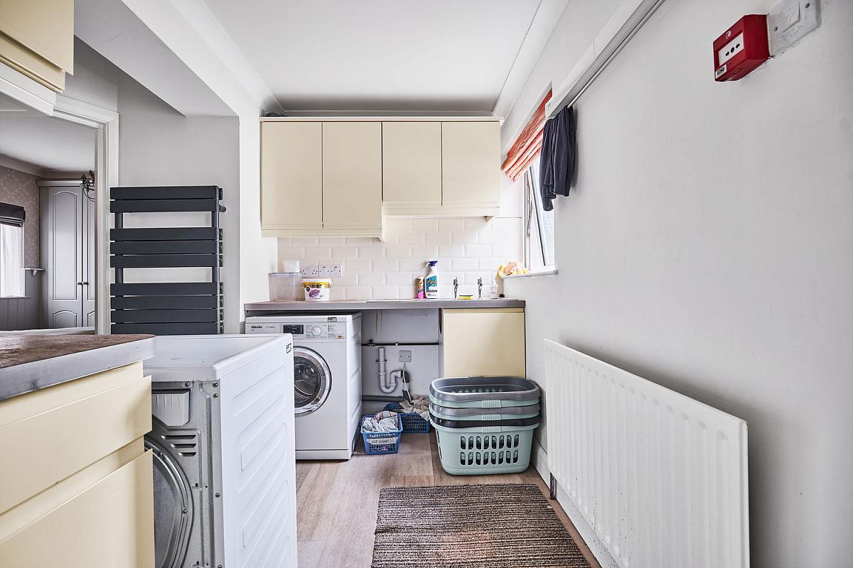 Plumbing for 2 automatic washing machines, 2 Condensing Tumble Dryers, a single bowl s/steel Sink Unit, full height storage cupboards, drawers, counter-top and eye and low-level fitted cupboards. A heated towel rail, radiator and wall-mounted airer combine to ensure laundry tasks here are a breeze.