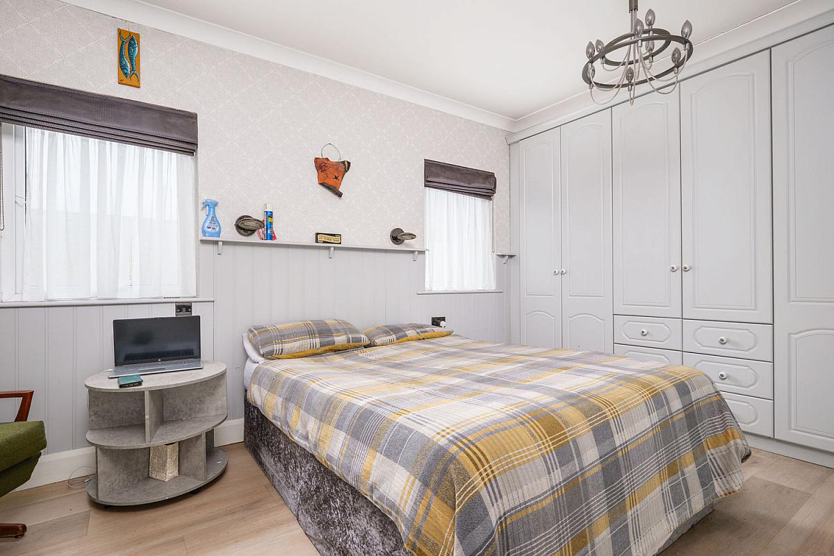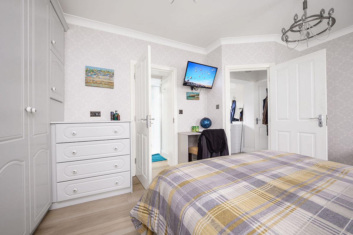 This charming and spacious double room featuring ceiling coving and twin windows currently accommodates a king size bed but has space for a superking. The wall-mounted bedside tables with USB charging points, wall-mounted reading lamps, 2 overhead chandeliers, a feature gunmetal full height radiator, wall-mounted TV, 3 fitted double wardrobes with drawers, fitted chest of drawers and dressing table and a freestanding tallboy are all included, as are the roman blinds, voile window coverings and limed oak vinyl click flooring.