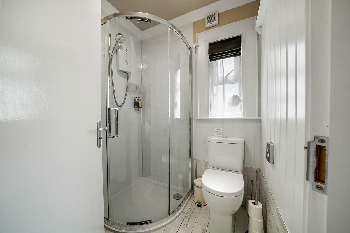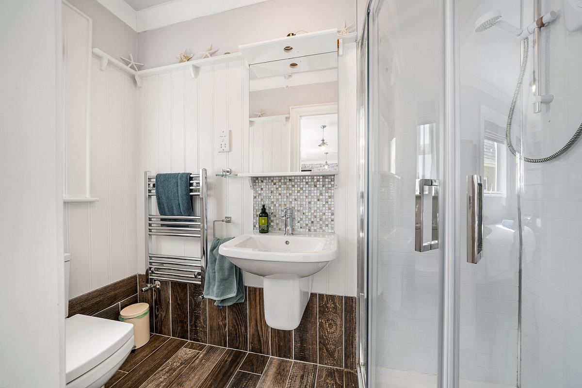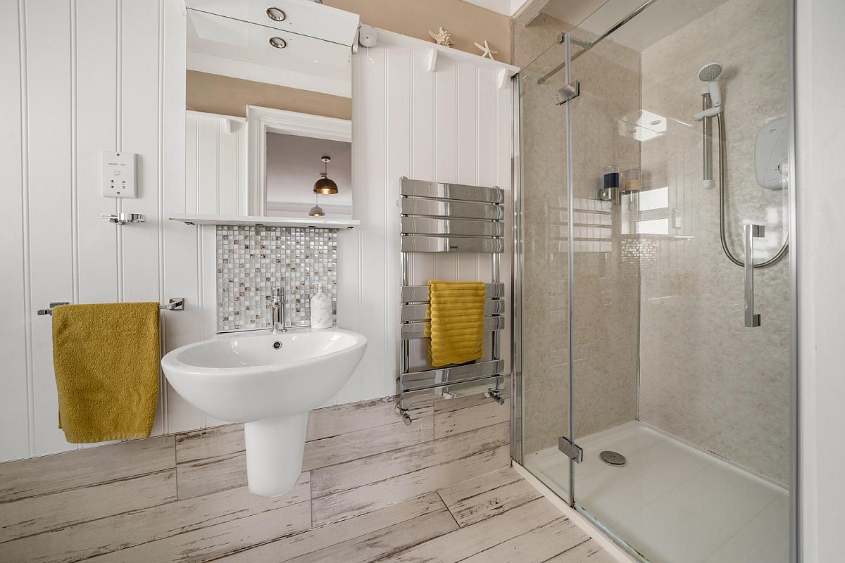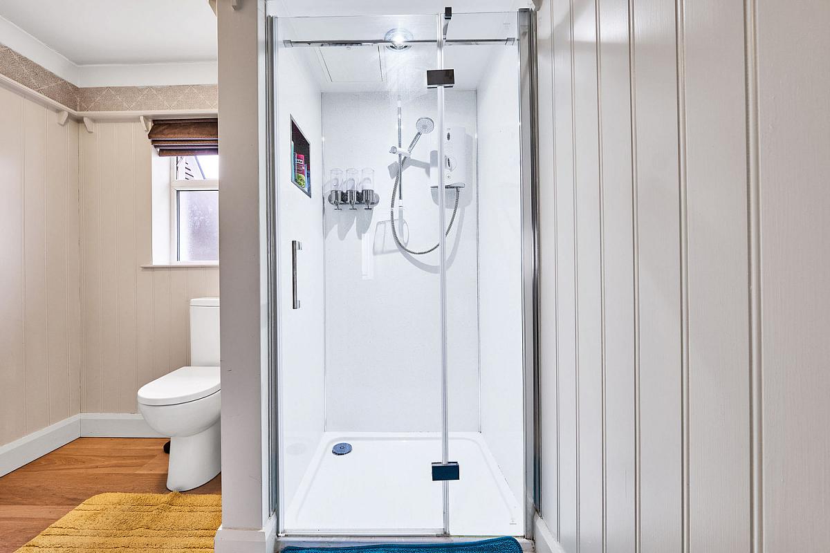 bathroom features a 110cm wide shower, with sliding glass door and fully clad internally with uPVC sheeting, recessed shelving and a wall-mounted Simple Human shampoo dispenser; a close-coupled w.c., wall-mounted semi-ped wash hand basin, LED illuminated wall mirror; heated towel rail, extractor, shaver point and overhead captain style light fitting. With a wood effect ceramic tiled floor and walls clad to a height of 2m with painted Reed and Bead panelling and top shelf, there is