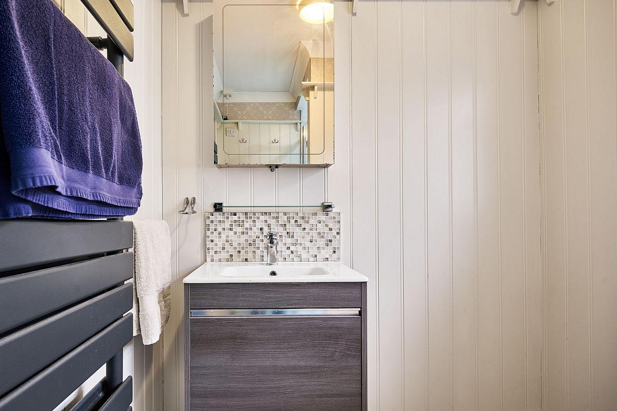 This spacious shower room comprises a back to wall w.c, wall-mounted semi-ped wash hand basin, LED illuminated wall mirror and shelving unit, a heated towel rail, shaving point, extractor and overhead bubble chandelier lighting. The spacious 1m x 1m shower cubicle is fitted with a hinged glass door and panel, a pumped power shower, recessed s/s alcove, wall-mounted Simple Human shampoo dispenser and is fully clad in uPVC cladding. The floor is tastefully tiled with blond wood effect ceramic tiling and there is painted reed and bead wall cladding to the walls, continuing the nautical theme. The window treatment of faux roman blind and voile netting is included.