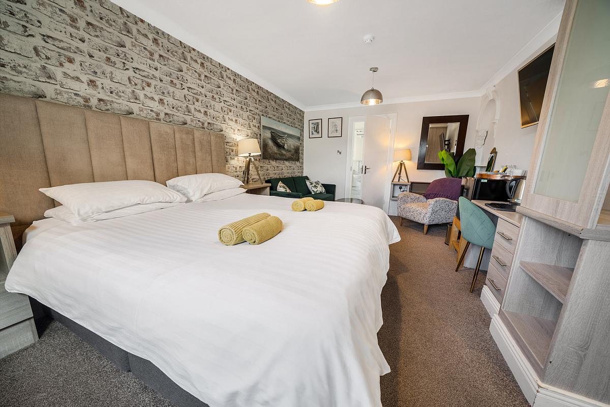 ample room for the bedside seating, wall-mounted bedside tables complete with convenient USB charging points and double sockets. Built in dressing table, chest of 3 drawers, luggage rack and the double wardrobe. A wall-mounted TV, triple globe ceiling light fitting, Roman blind and fitted carpet are included and combine to give this room a cosy ambience.